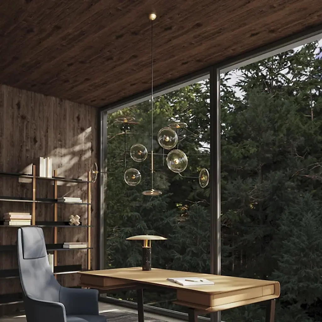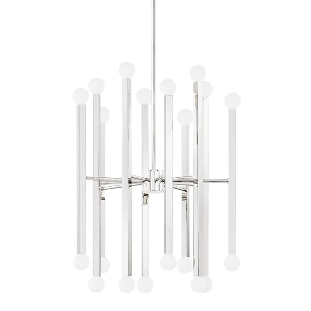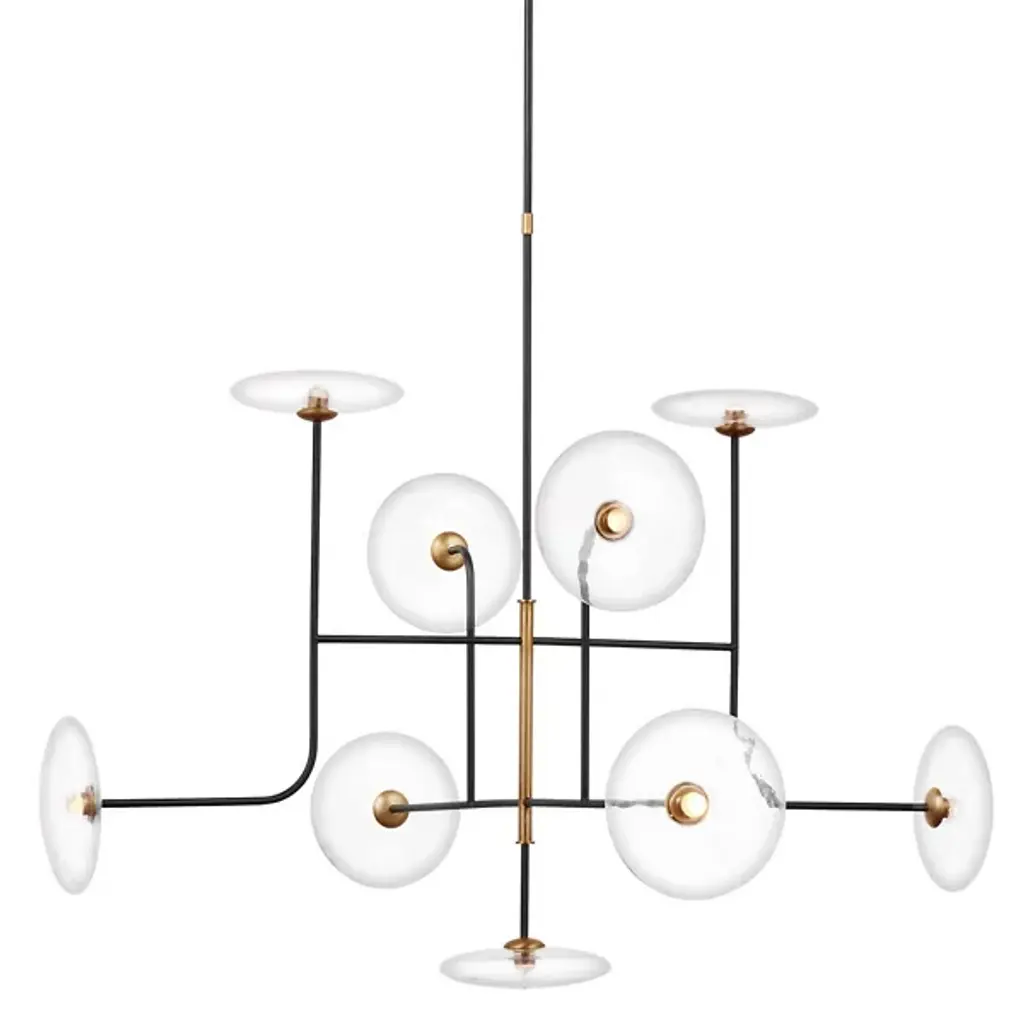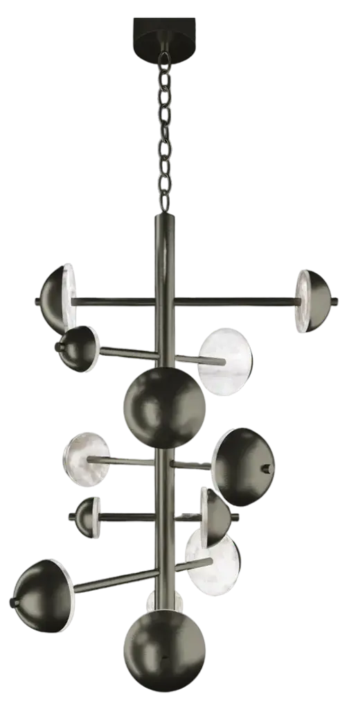 A wide-reaching open design with a stylish sculptural spirit. The Calvino LED Arched Chandelier from Visual Comfort Signature, formerly known as Visual Comfort, offers a slender, appealing addition to large, high-ceilinged spaces. A dome-shaped ceiling mount retains the fixture from above, sending down a matte-textured slim central stem to a cylindrical sleeve that extends a set of slender, horizontal bracings. These small arms then support a series of slim, curving arms headed out in all cardinal directions. Each arm terminates in a small, damp-rated lamp at the center of a shallow, clear glass dish shade that moderates glare from the sides while focusing out a wide wash of direct light in all directions.