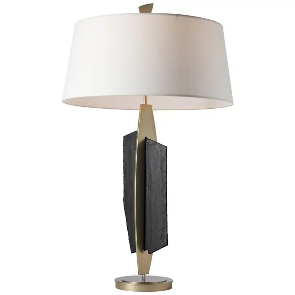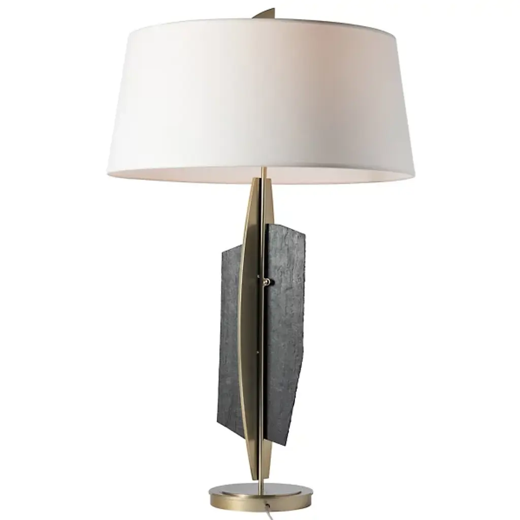 The natural materials that abound in Vermont inspired the elegantly rustic Cambrian Table Lamp by Hubbardton Forge. The core of the base is steel, with a sleek ellipsis adorning the otherwise slender stem. On either side, slabs of natural Vermont slate add one-of-the-kind texture and dimension to the overall design. A flared fabric drum shade visually complements the angularity of the base elements while also casting a broad wash of ambient light around a living room or home office.