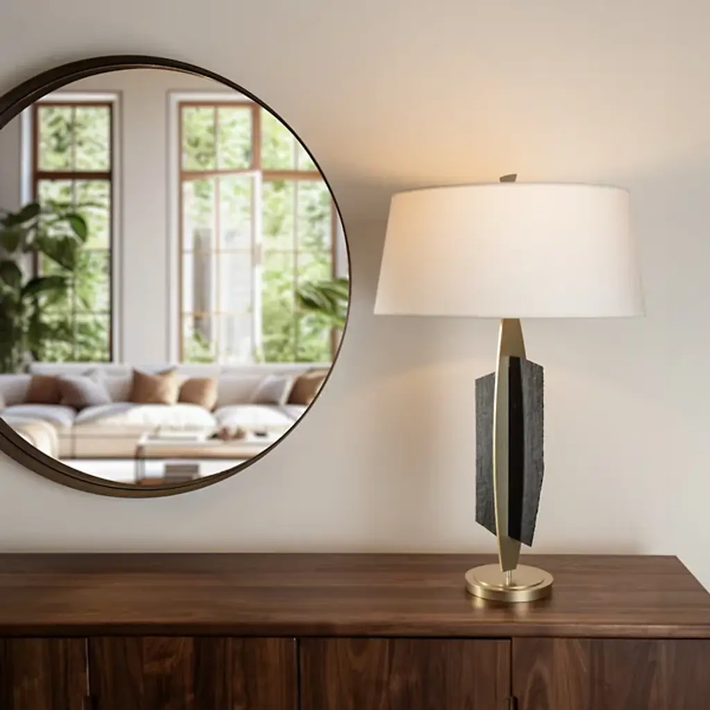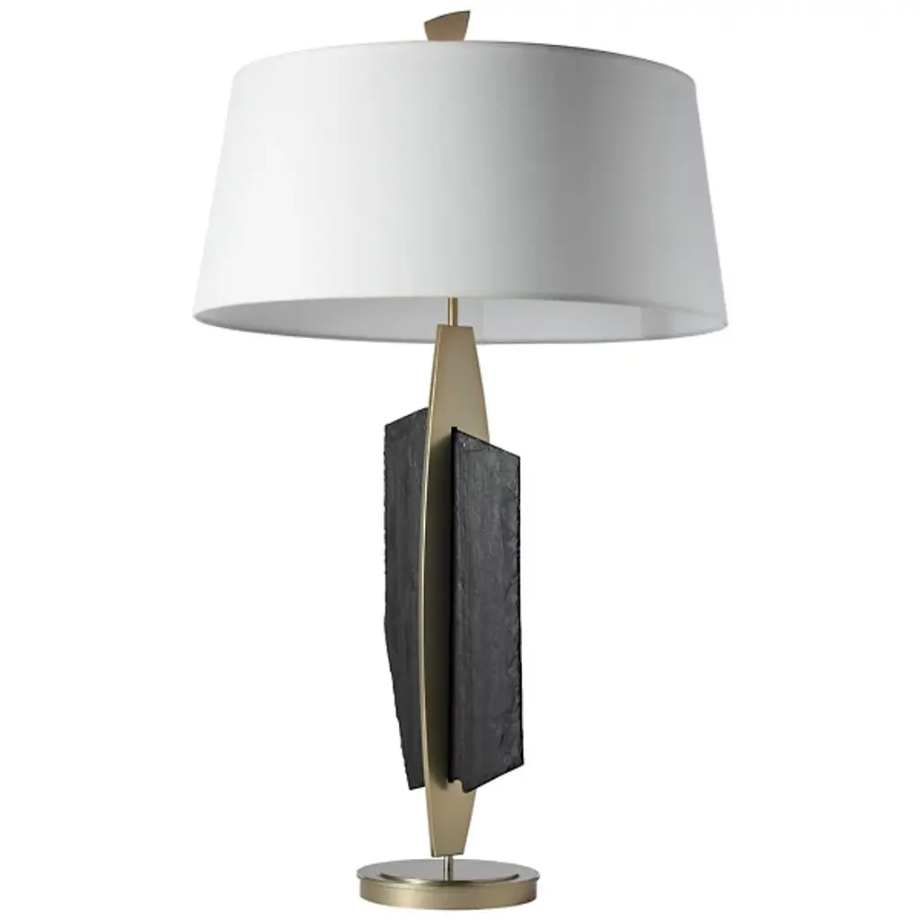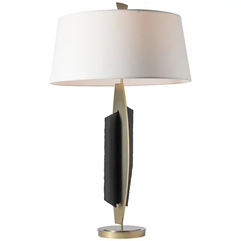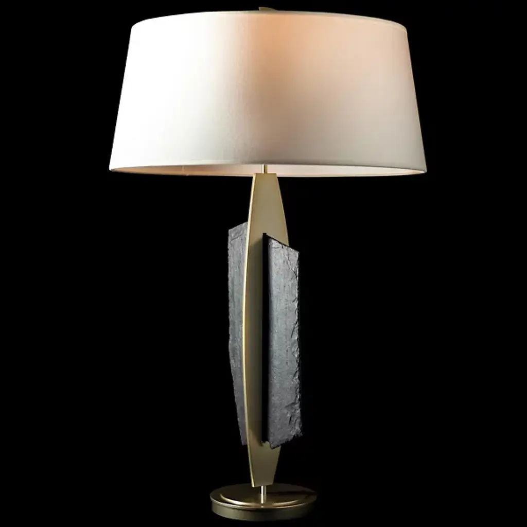 The natural materials that abound in Vermont inspired the elegantly rustic Cambrian Table Lamp by Hubbardton Forge. The core of the base is steel, with a sleek ellipsis adorning the otherwise slender stem. On either side, slabs of natural Vermont slate add one-of-the-kind texture and dimension to the overall design. A flared fabric drum shade visually complements the angularity of the base elements while also casting a broad wash of ambient light around a living room or home office.