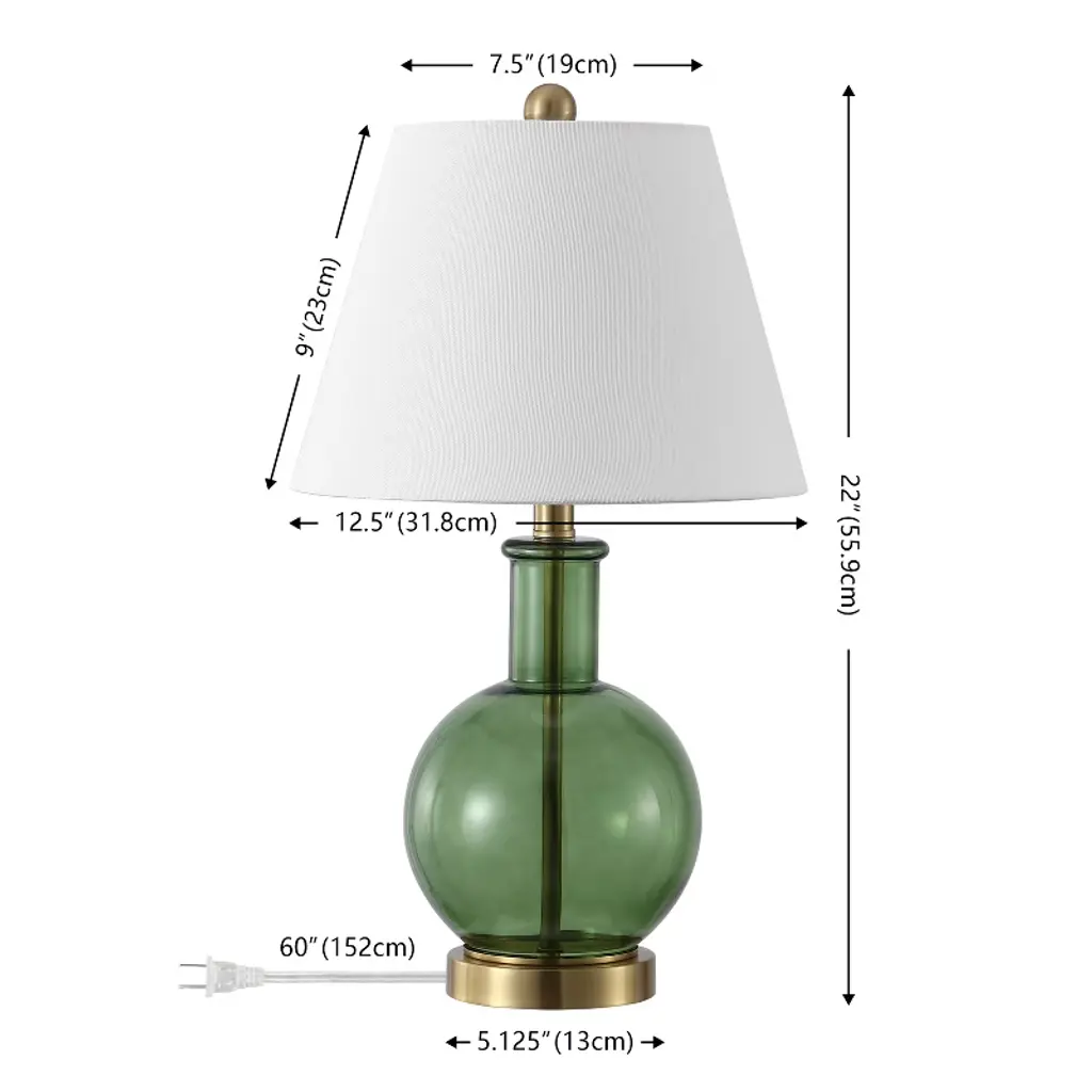 Illuminate your space with the charming CAMELIE table lamp set, a captivating duo that brings a touch of elegance to any room. Standing at 22 inches, each lamp features a harmonious blend of green and brass, perfectly complemented by a glass body that glows with subtle sophistication. The fabric shade softens the light, creating an inviting atmosphere that enhances your living area, bedroom, or office. These lamps are more than just lighting; they are statement pieces that effortlessly draw attention and admiration. Whether you're seeking to infuse your decor with a pop of color or to underscore it with a subtle accent, these lamps offer versatile design possibilities. The graceful combination of green and brass embodies both tradition and modernity, allowing these lamps to fit seamlessly into diverse settings. Bring refined elegance to your home with the CAMELIE table lamp set, where style meets function beautifully.