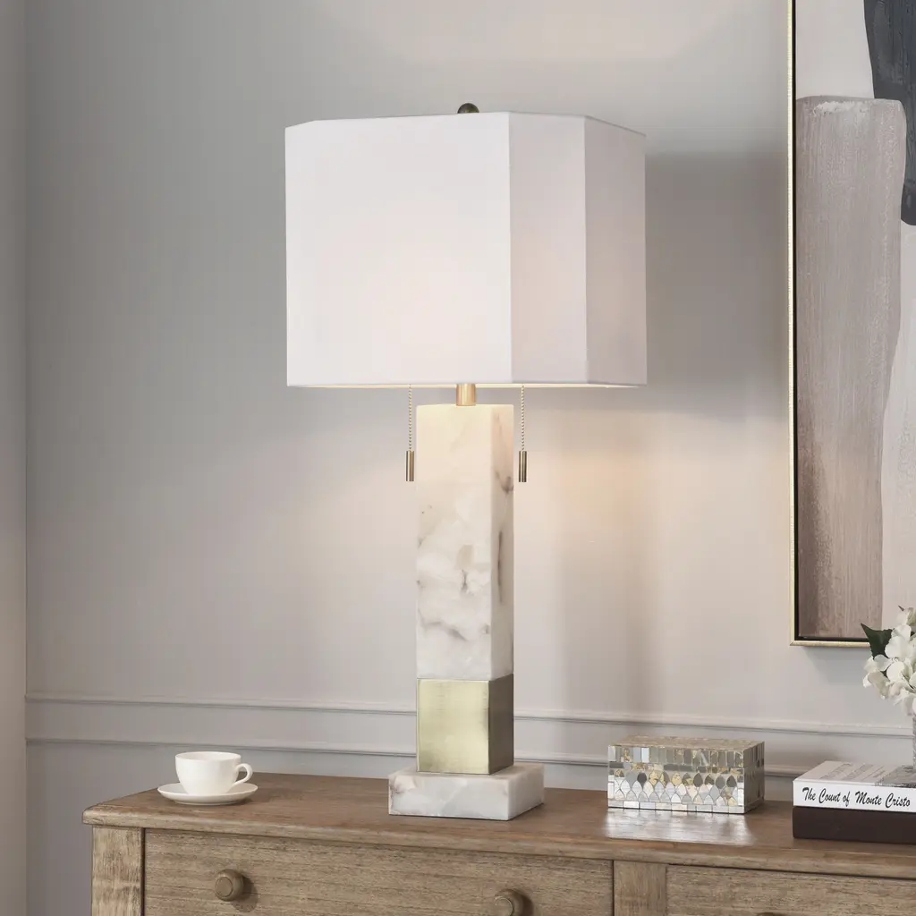 Experience the sophisticated appeal of this marble and fabric table lamp. Its sleek design makes it a standout piece in any living room, bedroom, or office. Perfectly suited for an entryway, this versatile lamp exhibits a timeless elegance that complements various decor styles.