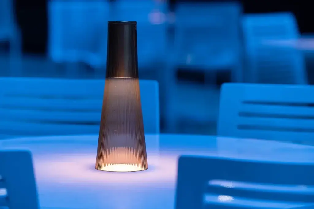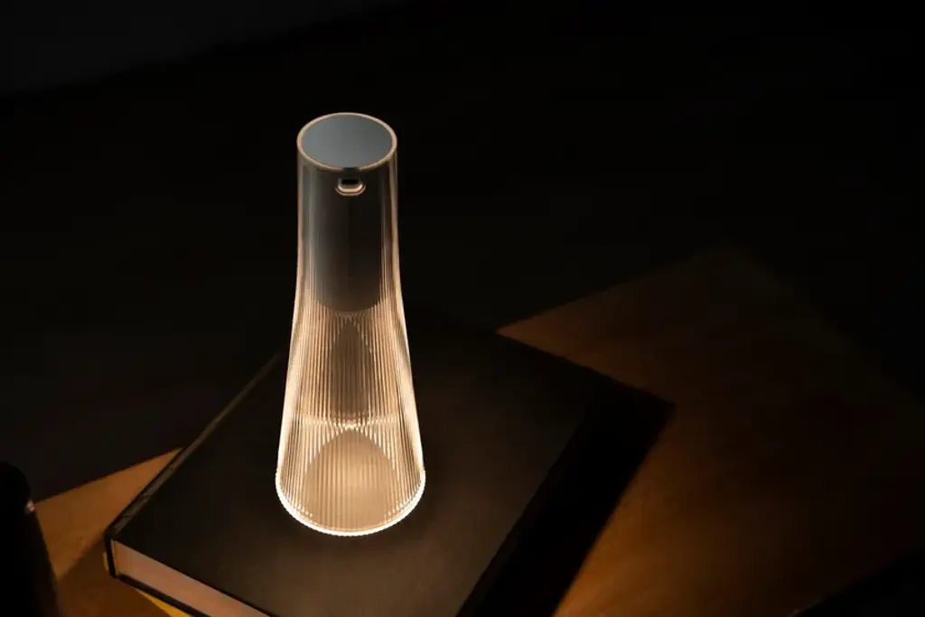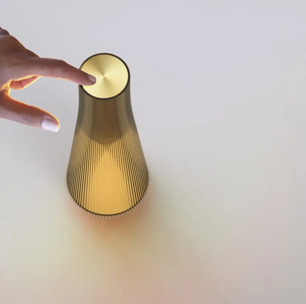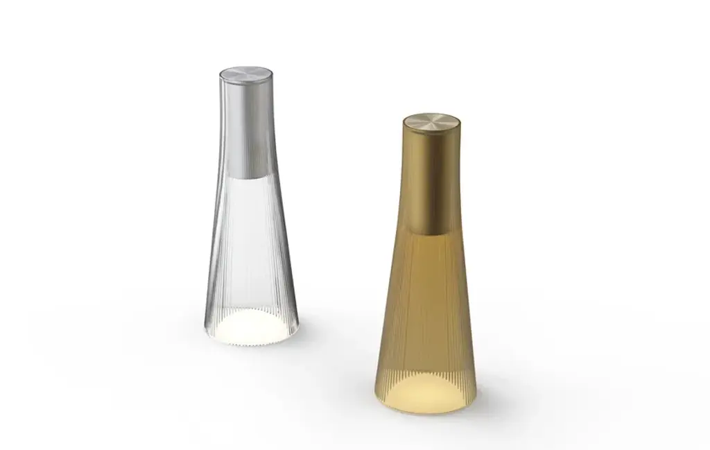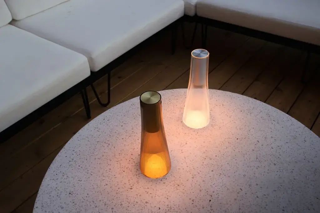Candél is a fully rechargeable portable LED light designed for both indoors and outdoors. Features a robust PMMA body in clear, Bronze, and Smoke tint combined with a striking anodized aluminum light and battery module that features capacitive touch technology for adjusting light intensity. Battery life: 8-100 hours depending on light intensity.Candel is a study in weightlessness and transparency, gracefully elevating its cylindrical machined aluminum light module over its elegant, fluted PMMA cone diffuser to provide glare free illumination while celebrating the surface below. Candél’s graceful proportions and scale feels right at home around dinnerware, stemware and wine vessels. It works beautifully in harmonious groupings at restaurants, cafes and outdoor terraces.Features4-stage step dimming10-150hr battery lifeUSB charging cable includedIP Rating: IP20SpecificationsVoltage: 120V-240V 50/60HzPower Consumption: 2.2WColor Temperature: 2500-1800KWarm DimLuminosity: 100 LumensColor Rendition Index: 90 CRICord Length: 6’ (1.83m) 3 hr Charge Time