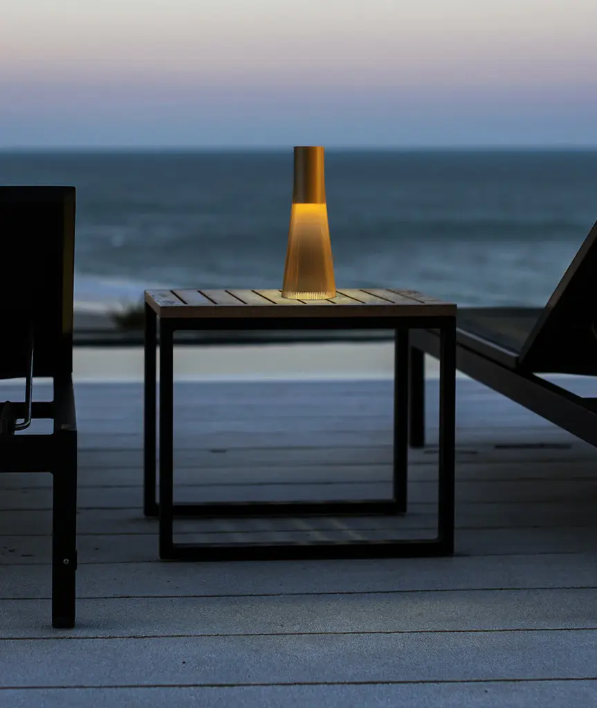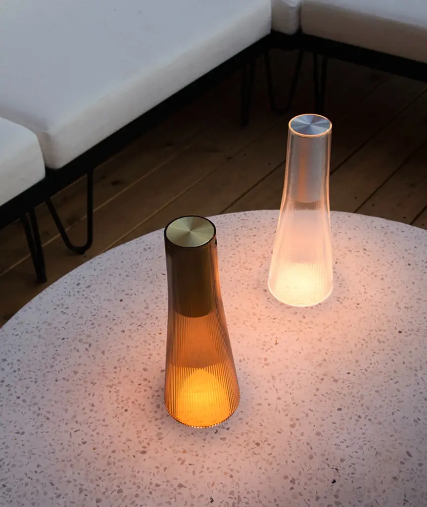 Inspired by a cone of light, Candél’s graceful vessel-like silhouette is in perfect harmony with its surroundings allowing the environment to filter through.  Candél casts a warm, intimate candle-like glow that’s sure to seduce and become the central focus of any social gathering. Candél is a fully rechargeable portable LED light designed for both indoors and outdoors. Features a robust PMMA body in Clear or Bronze tint combined with a striking anodized aluminum light module that offers capacitive touch light control to provide up to 4 light levels to set the perfect ambiance.