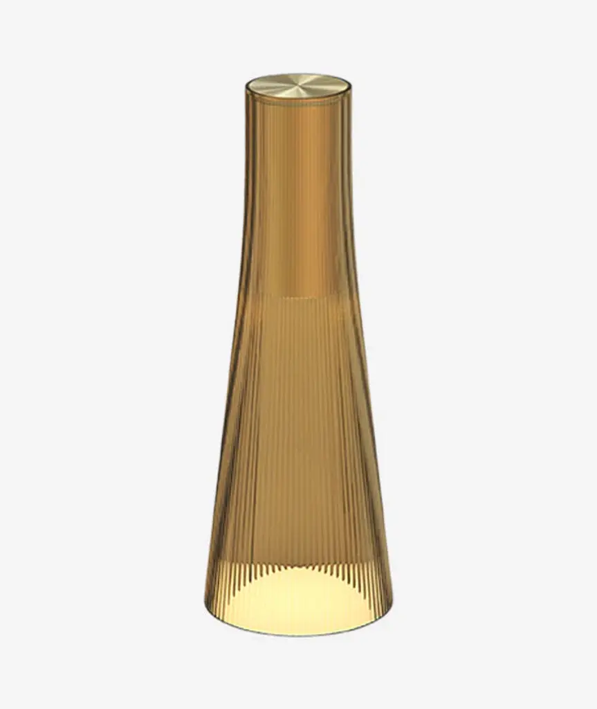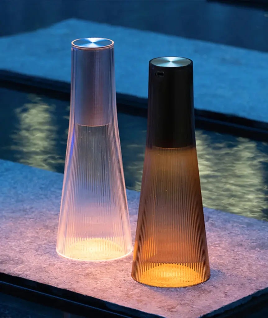 Inspired by a cone of light, Candél’s graceful vessel-like silhouette is in perfect harmony with its surroundings allowing the environment to filter through. Candél casts a warm, intimate candle-like glow that’s sure to seduce and become the central focus of any social gathering. Candél is a fully rechargeable portable LED light designed for both indoors and outdoors. Features a robust PMMA body in Clear or Bronze tint combined with a striking anodized aluminum light module that offers capacitive touch light control to provide up to 4 light levels to set the perfect ambiance.