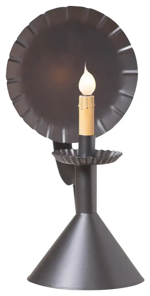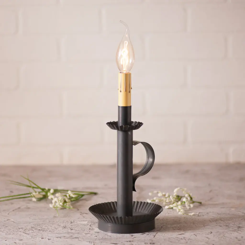 A tall candlestick lamp reminiscent of days gone by. Skillfully crafted by our team of metal crafters, the Candlestick Accent Lamp Base is wonderful when used on it''s own in the window or on a shelf. And for a change, it also looks great with one of our smaller pierced tin shades attached to the lightbulb. One great lamp, two different looks.Wired with E12/Candelabra socket, 60 watt max. Has a 3'' cord and line switch. Kettle Black finish. Bulb not included. Handcrafted in Pennsylvania.• Measures 9-Inches high and 5.5-Inches diameter• Wired with 7-foot cord and line switch; Plugs into wall outlet• E12/Candelabra socket, 1 x 60 watts maximum wattage• Made in the USA