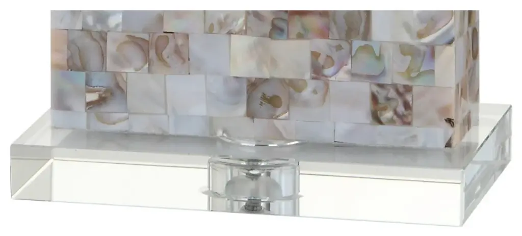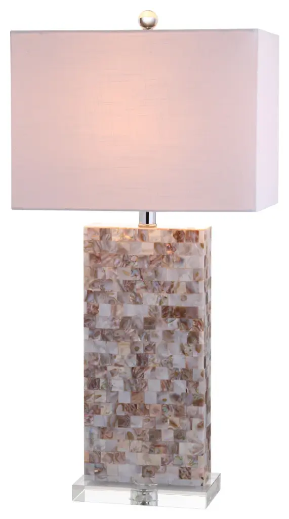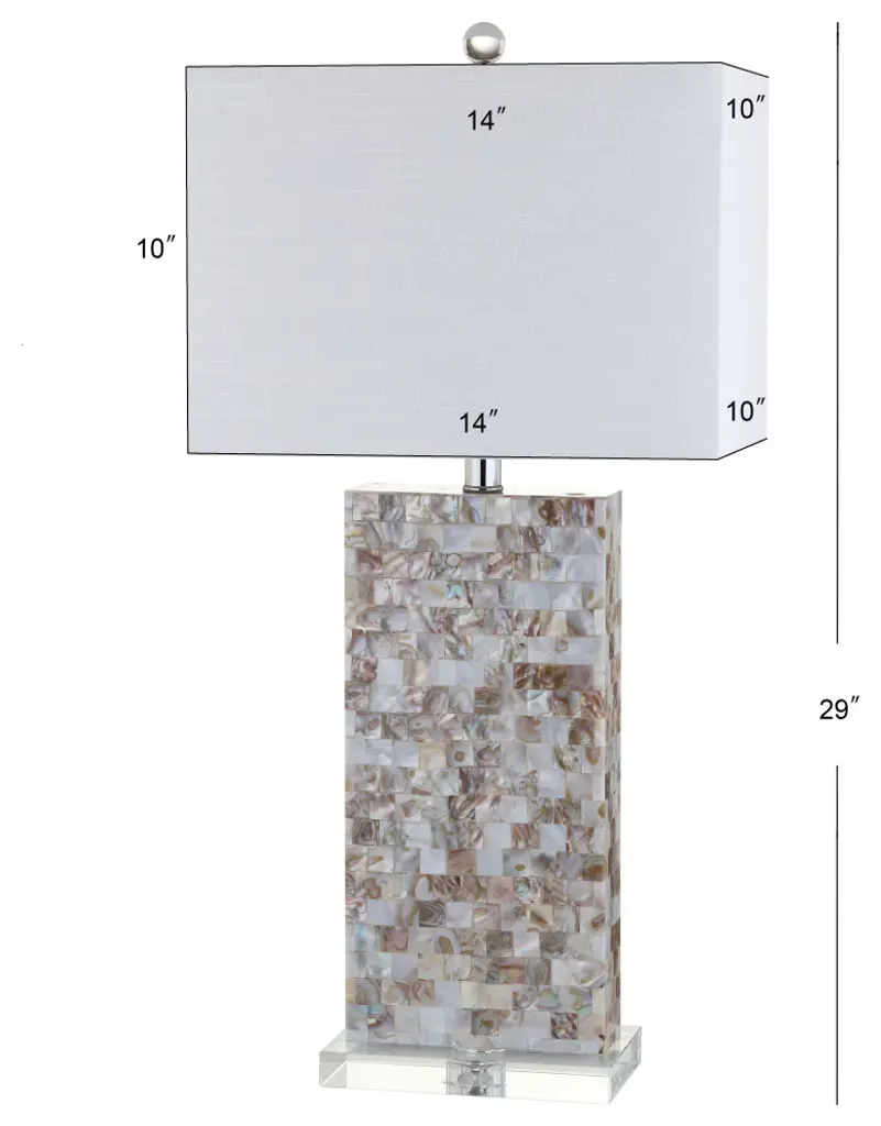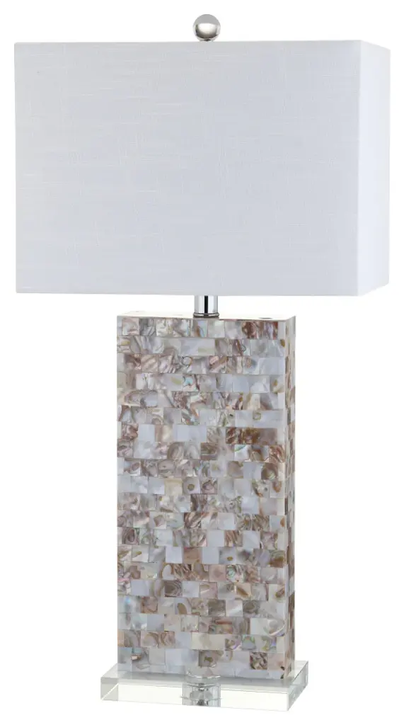 Cleanly geometric in a narrow footprint, the rectangular base of this 29" table lamp is carefully adorned with a mosaic of square capiz shell tiles and chromed accents atop an acrylic base. A white linen rectangle shade balances the look while a silk-wrapped cord provides style all the way to the plug. You''ll love how the shells reflect the warm glow of the bulb when illuminated and their many shades of natural beauty from ivory to bronze.-Geometric base with seashells applied in a mosaic design-100% cotton hardback rectangle shade in white-Beautiful to display or easy to conceal: the 60" cord is silk-wrapped-On-off rotary switch on socket-Takes one bulb and compatible with any type "A" 100 watt incandescent, 23 watt CFL, or 12 watt LED -Eco-friendly 9W LED bulb included-Sleep easy knowing that all components of this piece are UL Listed, safe for your home''s electrical grid -Color: Natural/Clear with white shade-Body Material: Resin / Seashell / Crystal-Base Material: Crystal-Finial Material: Crystal-Finial Color: Clear-Harp Color: Silver-Includes: One (1) lamp(s)-Minor Assembly Required-Lamp: 29 inches high x 14 inches wide x 10 inches deep-Shade: 10 inches high x 14 inches wide x 10 inches deepAbout us: You see a lamp.We see a decorative work of art.A perfectly curved shade casts a dramatic shadow on a floor. A silk cord you never want to hide. LED lightbulbs: as easy on the environment as they are on the eyes. The JONATHAN Y Lighting collection considers every detail from impeccably sourced materials to designer styling. And our prices are so attractive, we''ve transformed a functional necessity into a fashion accessory.JONATHAN Y Lighting - a fashion revolution in home decor.
