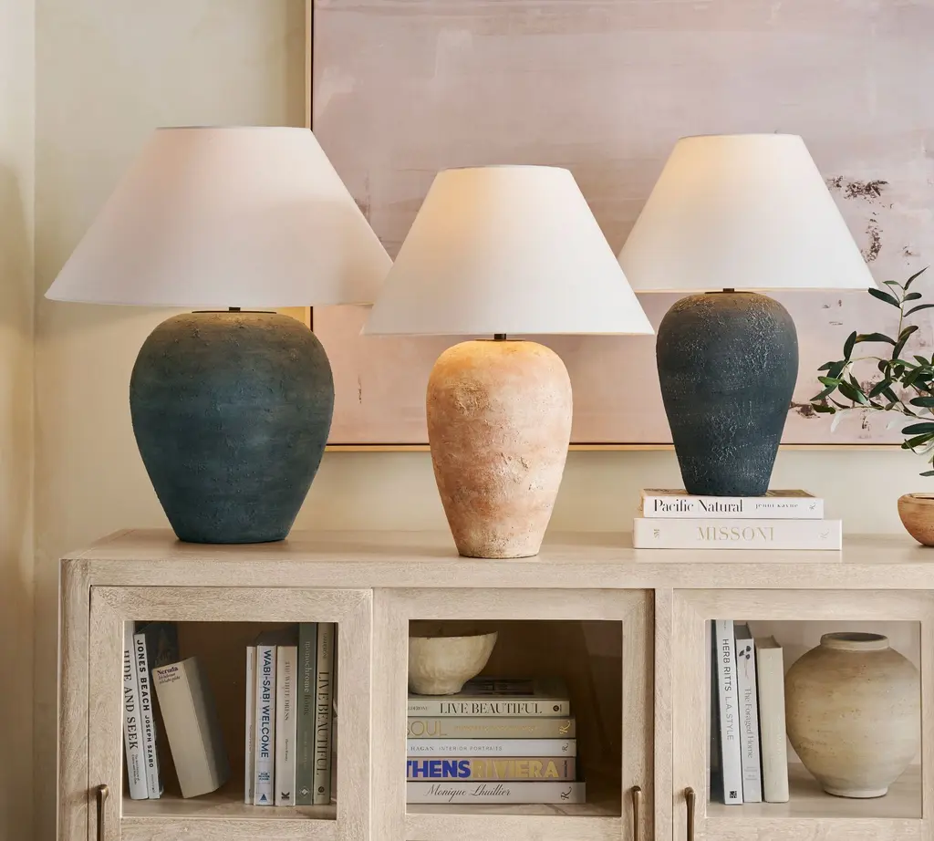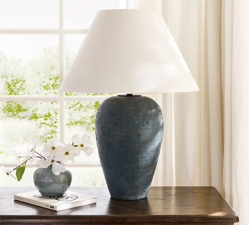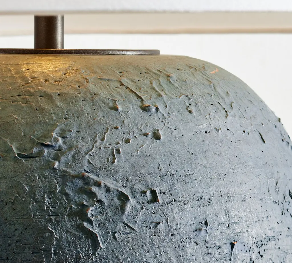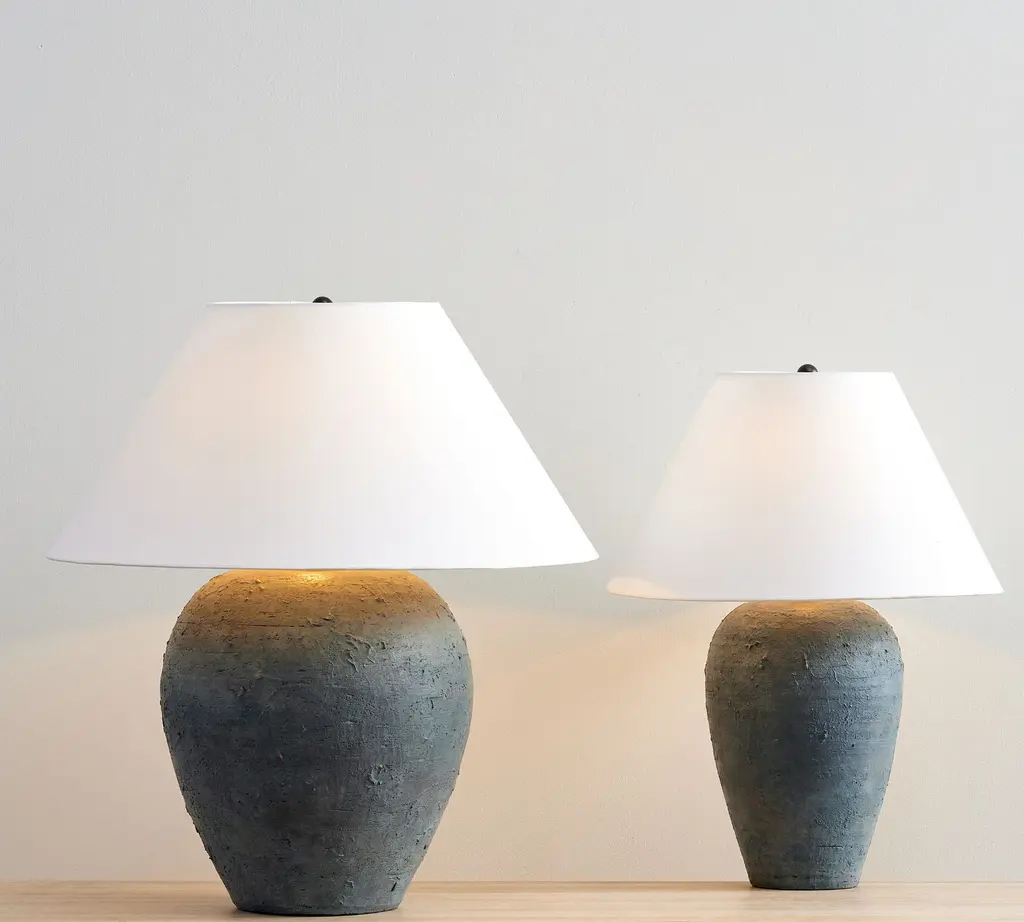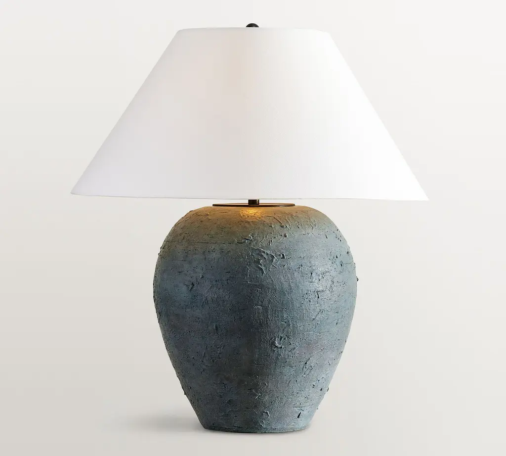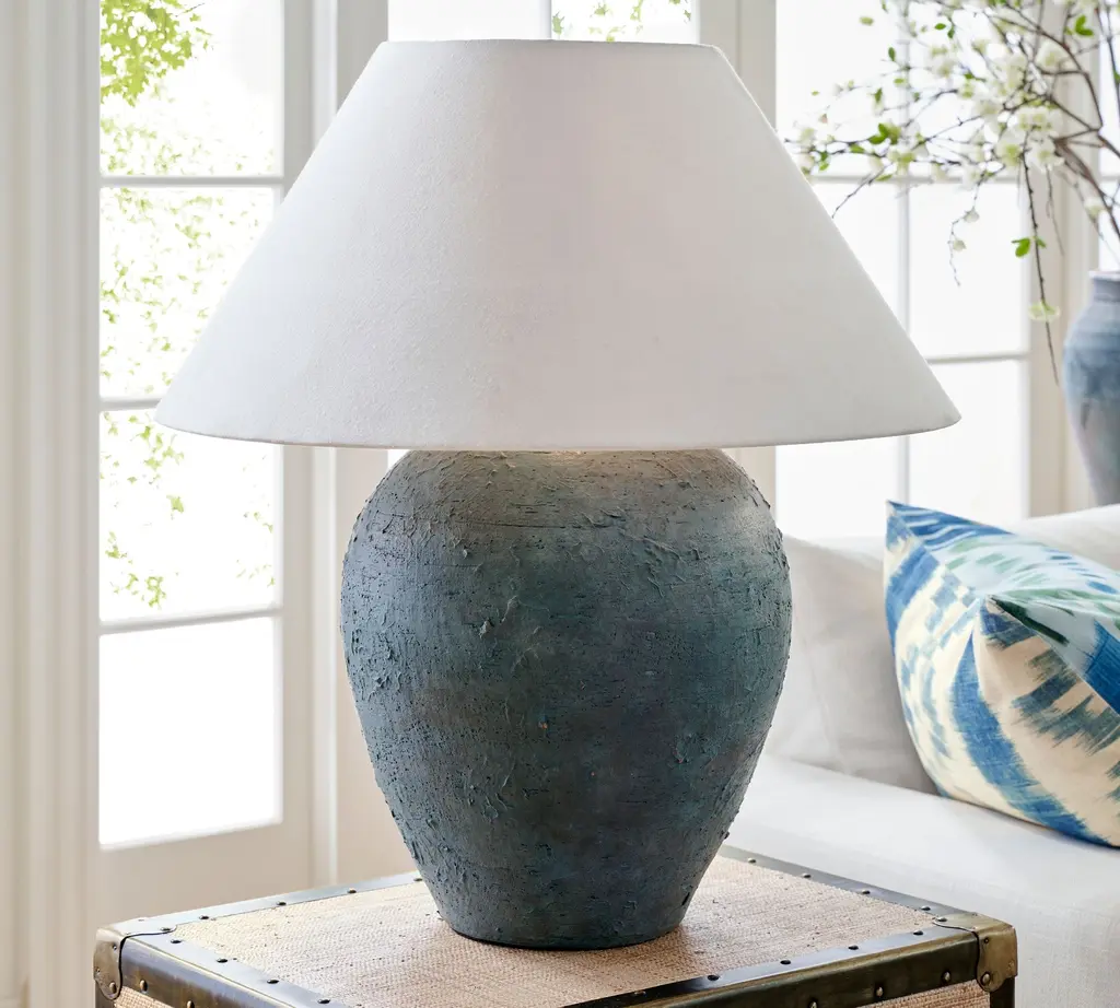 Reminiscent of architectural elements found in a garden, the base of this lamp displays hand-carved details that are highlighted by a crackled texture. A tapered shade gives it a classic European feel.