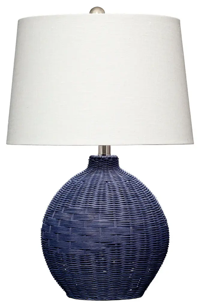 Bring the waterfront inside your home with this gorgeous table lamp. Its body is made of handwoven rattan with a subtle geometric pattern on the side. Paired with a white linen cone shade, its indigo blue or natural rattan will add a pleasant pop of color and serve as the perfect accent to your coastal casual décor.