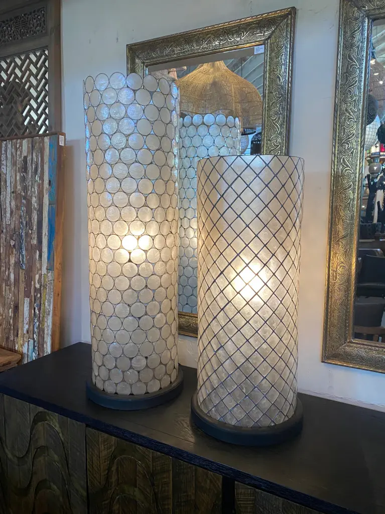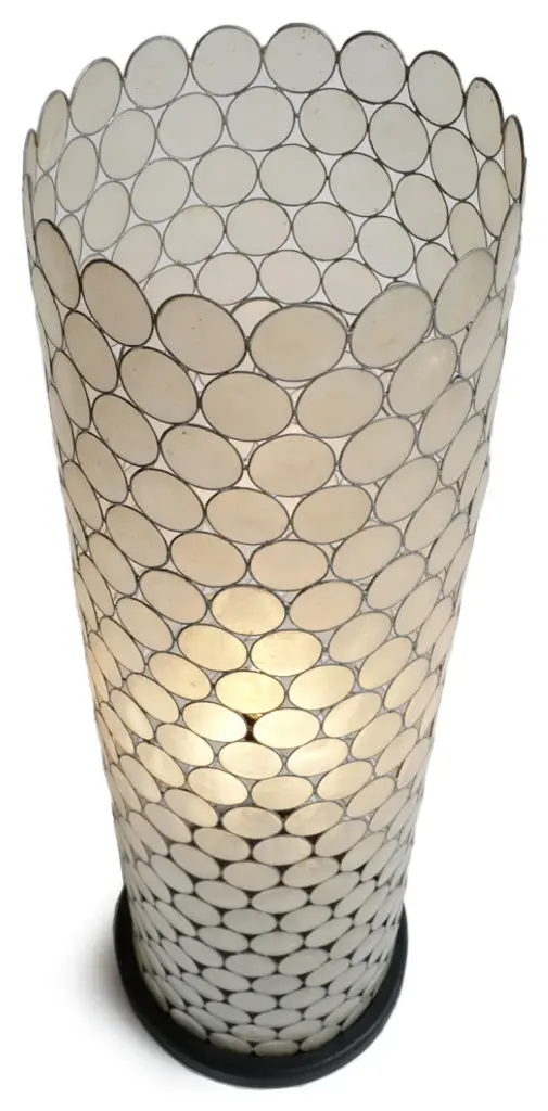 Striking cylindrical Capiz shell shade table lamp on black wood base. Intricate circle patterning of pewter finish metal frame and natural Capiz shell material. Each lantern is slightly unique in handmade details, natural imperfections, and tones of material. This is an extra fragile item meant for very careful use and handling. Includes cord for easy plug-in. 100 watt max fixture. Bulb not included. This item is non-returnable - all sales are final.Bulb Type: 100 watt maxNumber of Bulbs: 1Bulbs Included: 0UL Certified