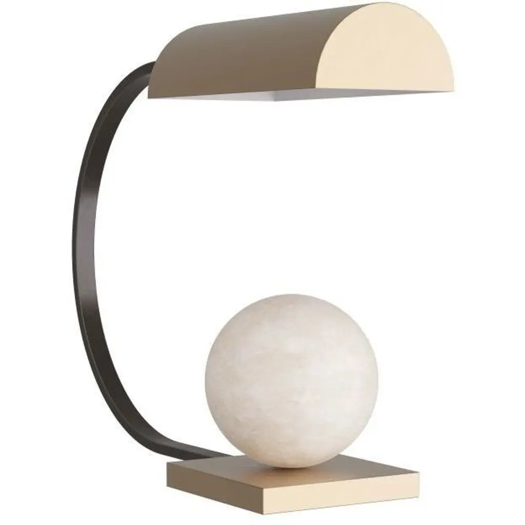 Accent your spaces with the tasteful, abstract style of the Cara LED Table Lamp from Visual Comfort Signature, formerly known as Visual Comfort, A beautiful example of modern design, this piece provides a sense of flow to the space as separate pieces come together into a pleasing whole. A disc-shaped base mounts a spherical piece that extends a thin and open, elongated metal ring upwards. Resting on this ring is a wide and shallow white glass shade. The integrated LED rests just below the shade, emitting a bright and full glow upward, interacting with the shade and diffusing into a softer, ambient touch.