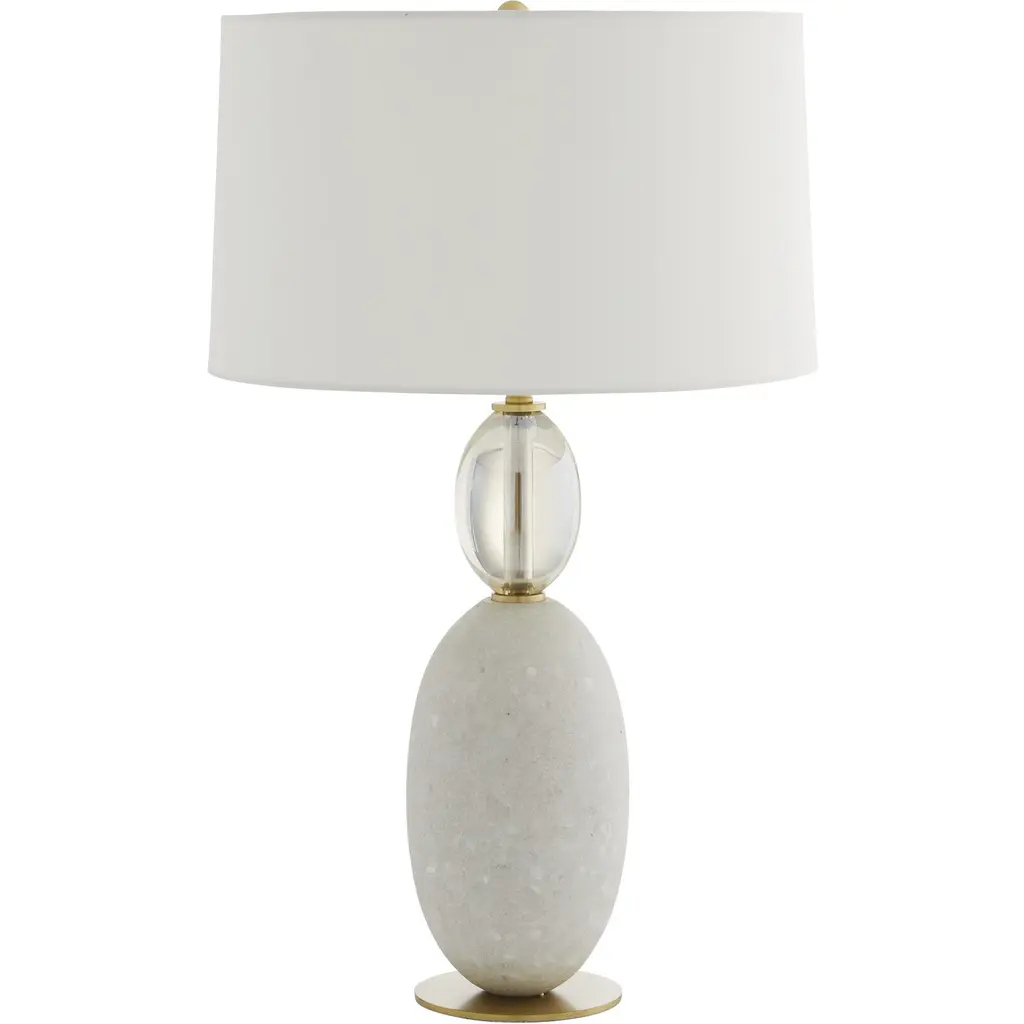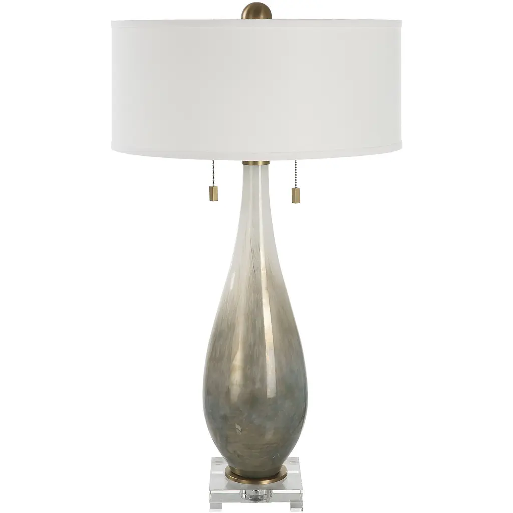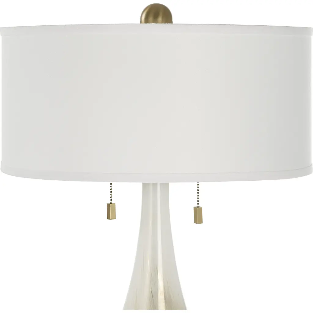 Gloss white glass featuring metallic smoked bronze hues accented with plated brushed brass metal details and a thick crystal foot. The round hardback drum shade is a white linen fabric with natural slubbing.