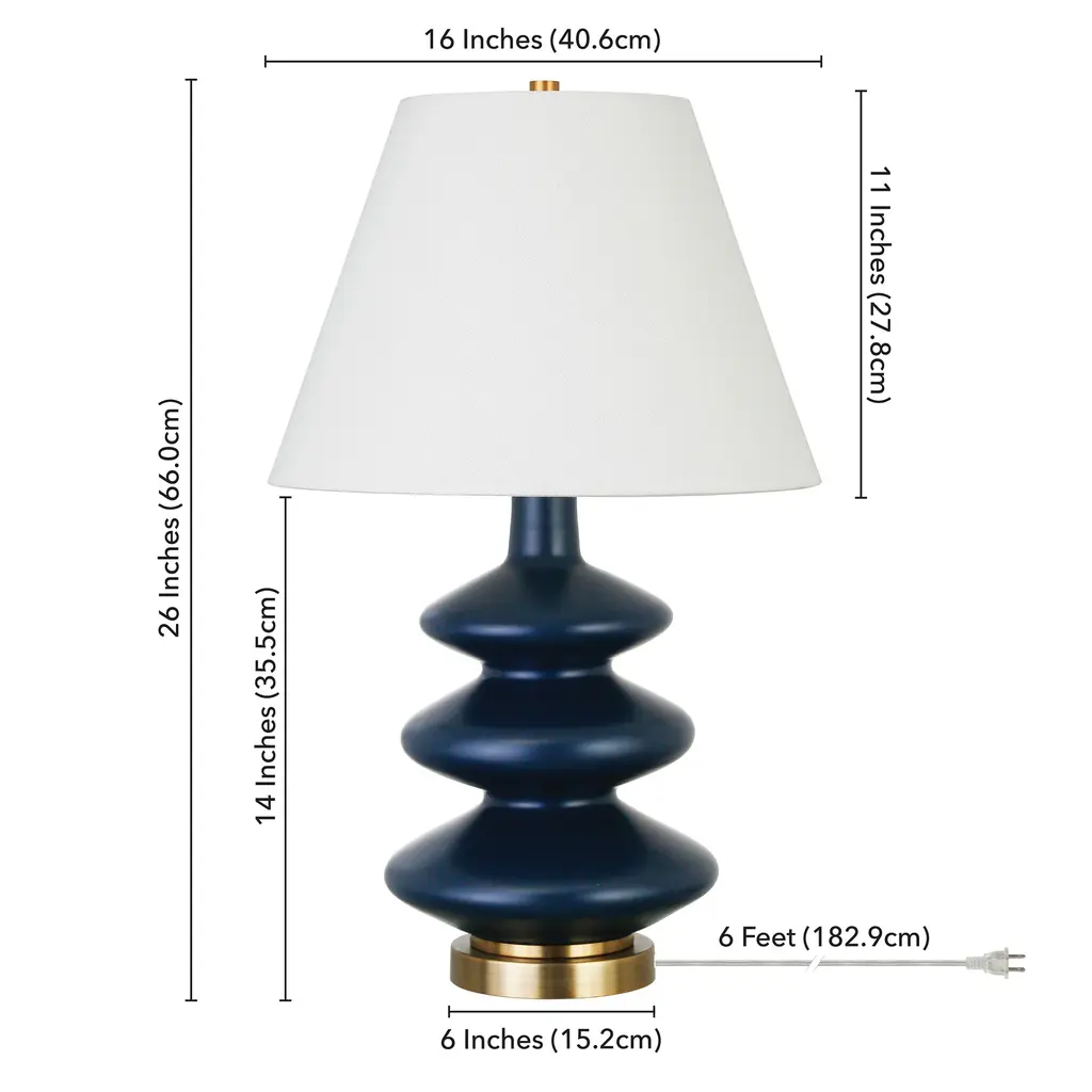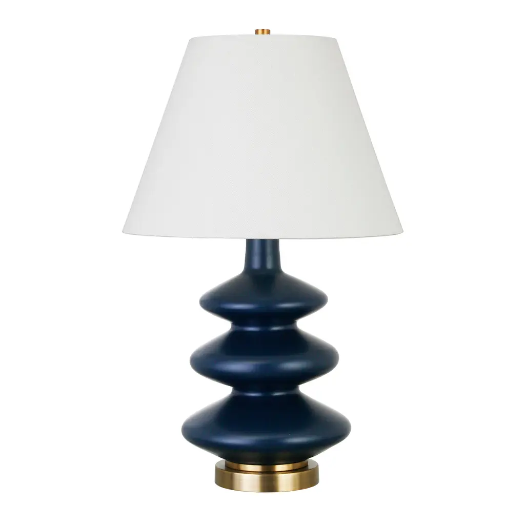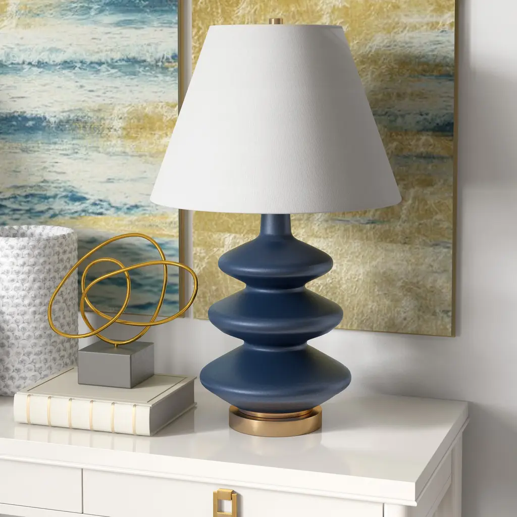 This contemporary table lamp features a triple gourd base made of glass. The body is finished with a matte exterior and is topped off with a white linen empire shade that complements the soft curves featured in the design. Features: • Premium materials have been used making this lamp: linen in the shade, steel in the frame and base, UL certified wiring components. And the finishes are hand done: the white finish is a rich true white finish, the blue a true blue that is crisp to the eye. • The glass frame is finished with a matte blue finish. • It is paired with a French empire shade. • The shade is in a crisp chiffon white color and is made of 100% linen with polystyrene lining for durability. • Rated for one 60W incandescent bulb; 9W LED bulb, 13W fluorescent (CFL) bulb, or 9W self-ballasted LED bulb. E26-base bulb. • Includes a 6 ft. cord. • Clean with a soft, dry cloth; no harsh chemicals or abrasive cleaning materials. Compatibility: • Compatible with smart light bulbs such as Philips Hue, LIFX, IOTTY, Texsens, Flux, Samsung SmartThings, WiZ, and C by GE. Bulb is not included.