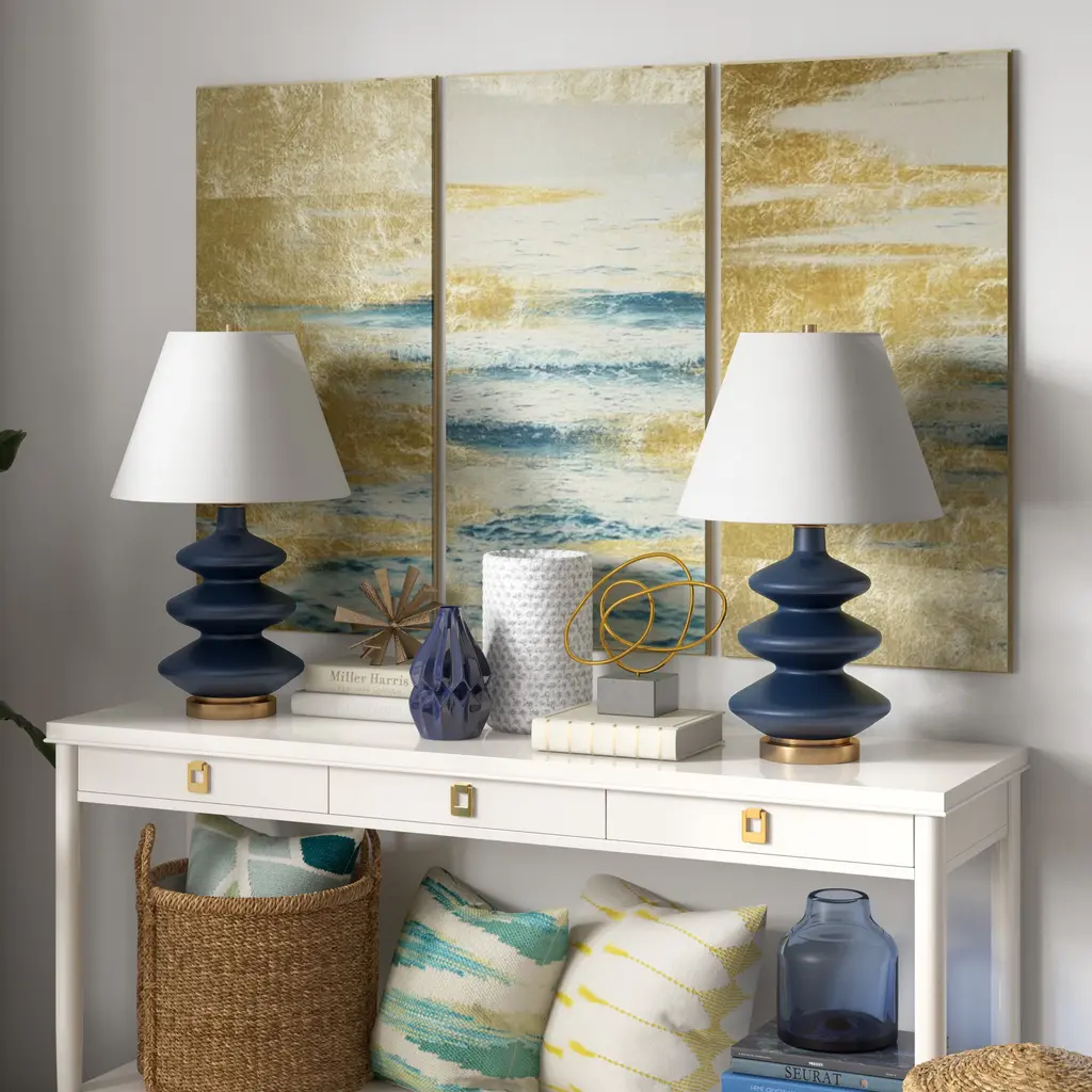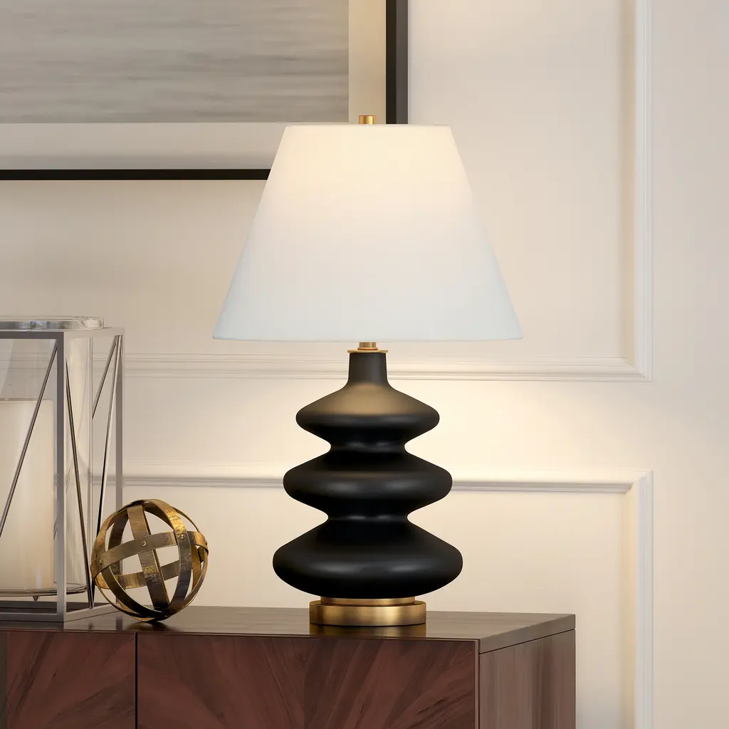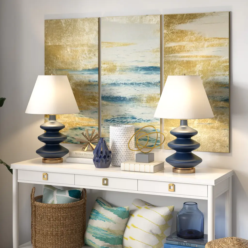 This contemporary table lamp features a triple gourd base made of glass. The body is finished with a matte exterior and is topped off with a white linen empire shade that complements the soft curves featured in the design. Features: • Premium materials have been used making this lamp: linen in the shade, steel in the frame and base, UL certified wiring components. And the finishes are hand done: the white finish is a rich true white finish, the blue a true blue that is crisp to the eye. • The glass frame is finished with a matte blue finish. • It is paired with a French empire shade. • The shade is in a crisp chiffon white color and is made of 100% linen with polystyrene lining for durability. • Rated for one 60W incandescent bulb; 9W LED bulb, 13W fluorescent (CFL) bulb, or 9W self-ballasted LED bulb. E26-base bulb. • Includes a 6 ft. cord. • Clean with a soft, dry cloth; no harsh chemicals or abrasive cleaning materials. Compatibility: • Compatible with smart light bulbs such as Philips Hue, LIFX, IOTTY, Texsens, Flux, Samsung SmartThings, WiZ, and C by GE. Bulb is not included.