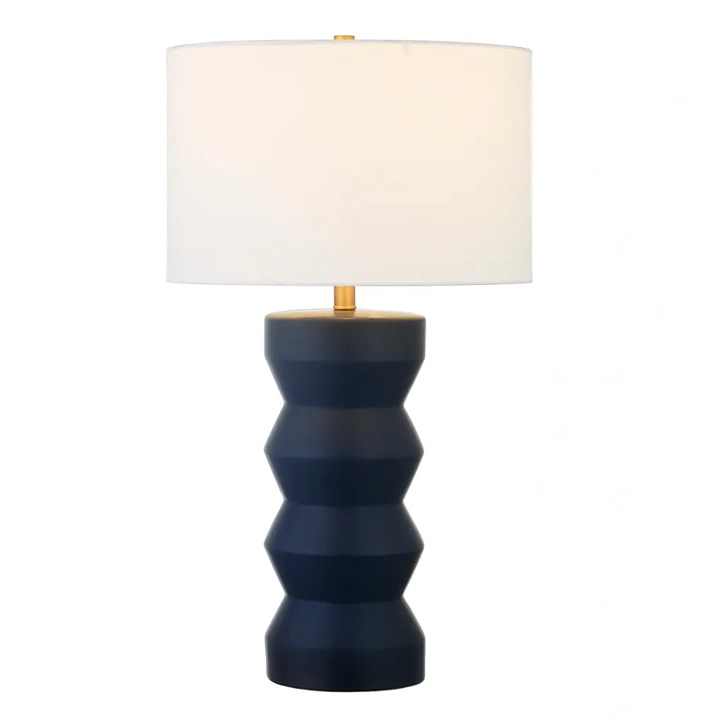 Add a touch of textured style to your living room, bedside, or den with this contemporary table lamp. It features a ribbed ceramic base finished with a matte exterior in a neutral tone to suit any color scheme. The fixture is topped off with a crisp white linen drum shade that perfectly complements the soft curves featured in the design. Features: