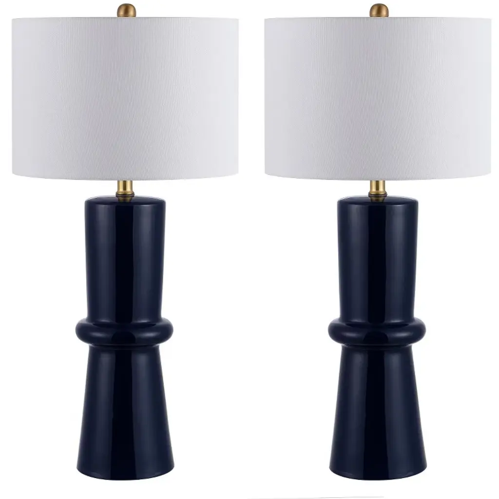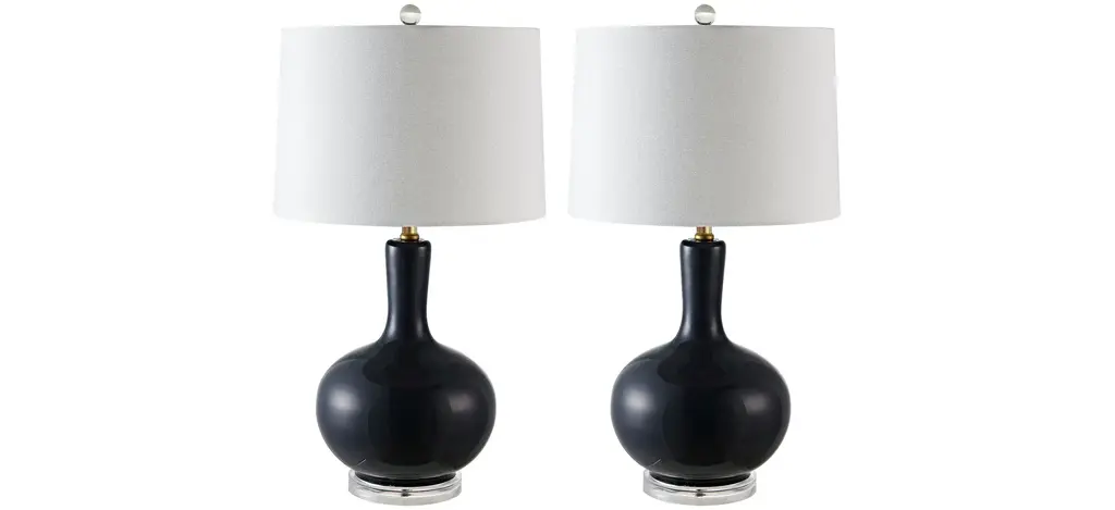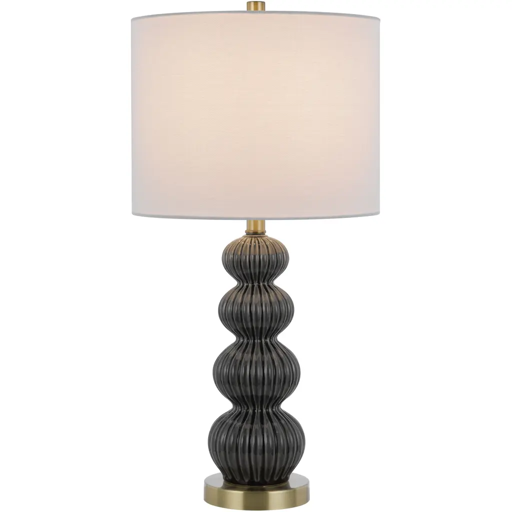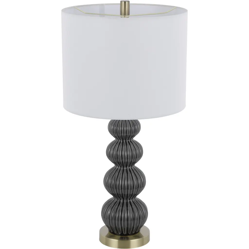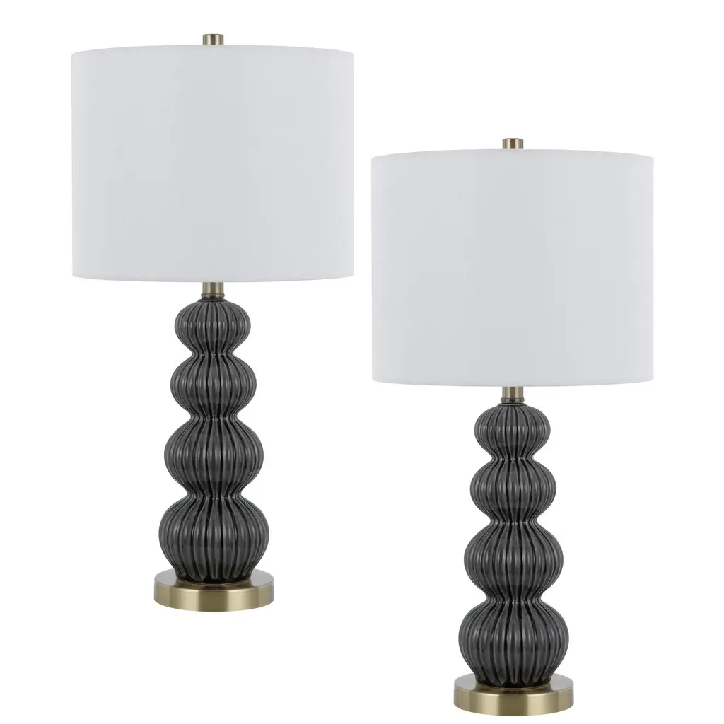 Add a coordinated look to your room with this matching set of ceramic table lamps. They feature a stacked orb design with a dark grey enamel finish. The lamps ship together with matching white fabric shades.