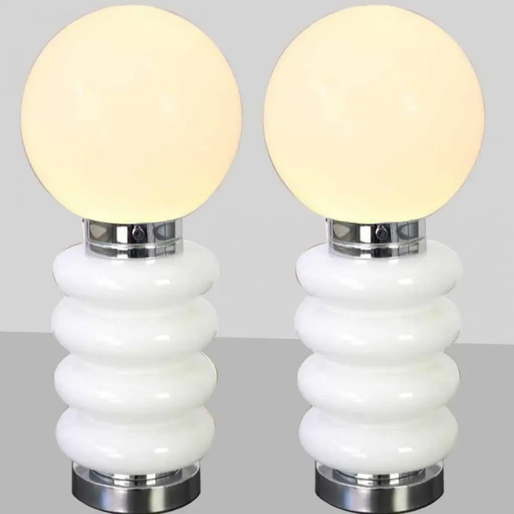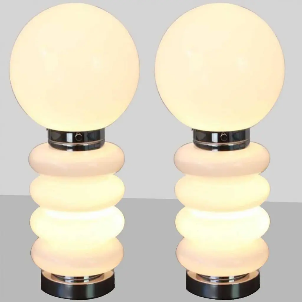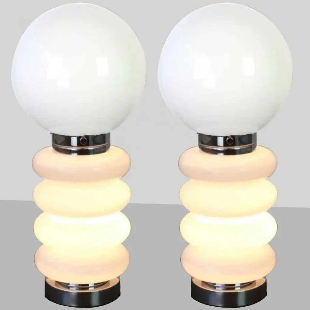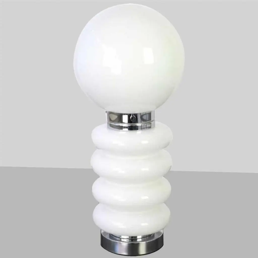 Carlo Nason parquet lamp "Bilboquet" in Murano glass, manufactured in Italy, 1970sCarlo Nason for Mazzega Murano white glass and chrome floor lamp. Featuring two hand blown opal white glass illuminated diffuses with center waist and base strip in chrome plate. Dual floor switch. Modern smooth surface and great shape. Translucent. Sculptural. Statement lighting. Made in Italy.Measures: Height 56 cm, 22 inchesDiameter 25 cm, 9.8 inchesPlease notice the price is for 1 piece, 2 pieces available.In very good condition. Cleaned well wired and ready to use. Each light fixture requires 3 x E14 small bulbs (each max 40 watts) LED compatible.