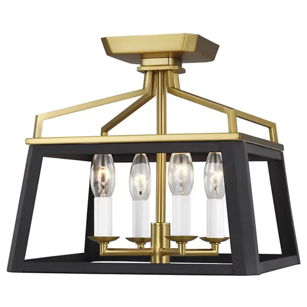 Add compact class to low-ceilinged spaces with the Carlow Flushmount from Visual Comfort Studio, formerly known as Chapman & Myers, Retained by a beveled canopy, it extends a slim central stem below, ending in a hub that dispatches small horizontal branches out to short candelabra lamps. A trapezoidal frame encompasses the lamping, which blazes out brightly and is primarily unrestricted with a matte lower end contrasting well with an angular upper frame that reflects a glittering glow around the bright lamping.