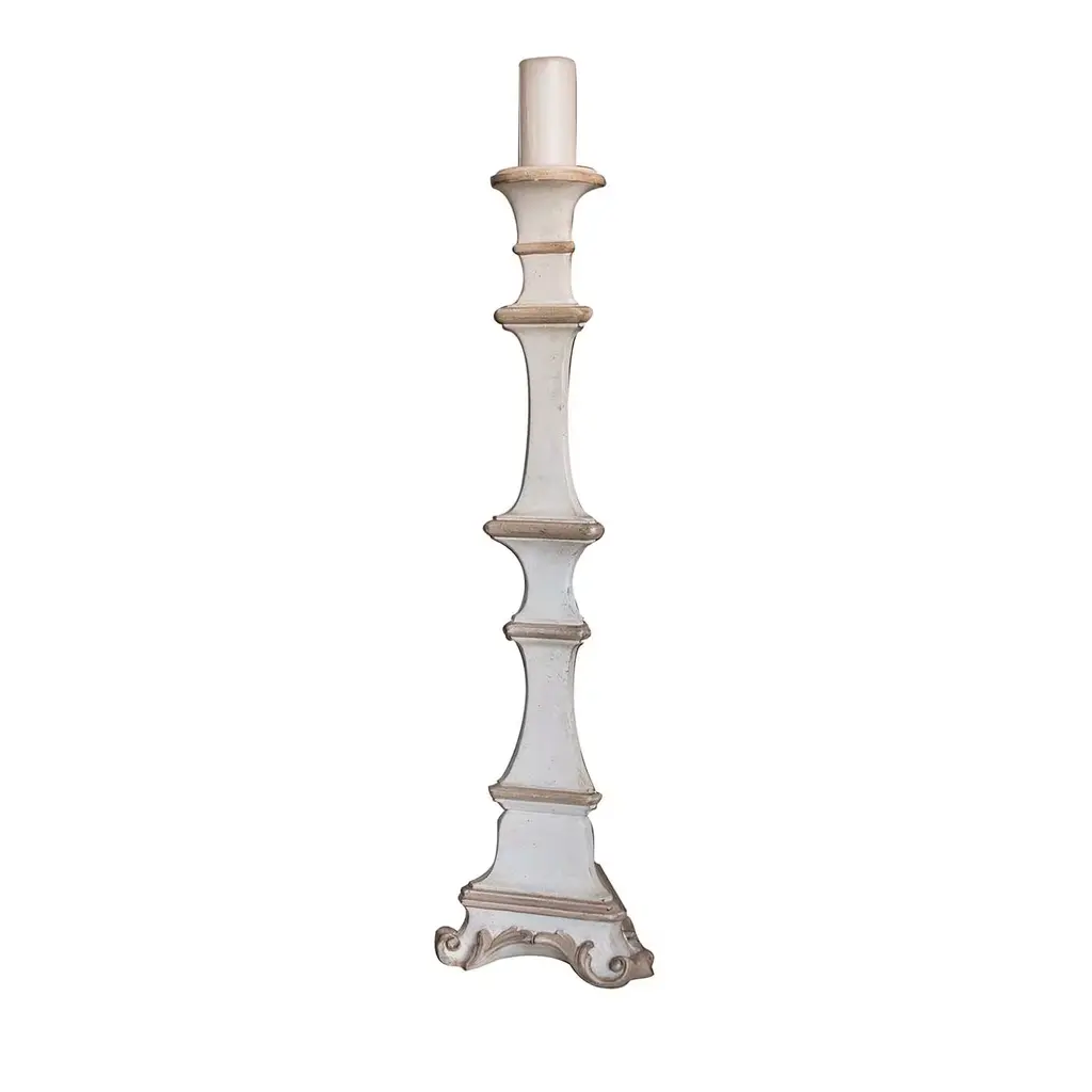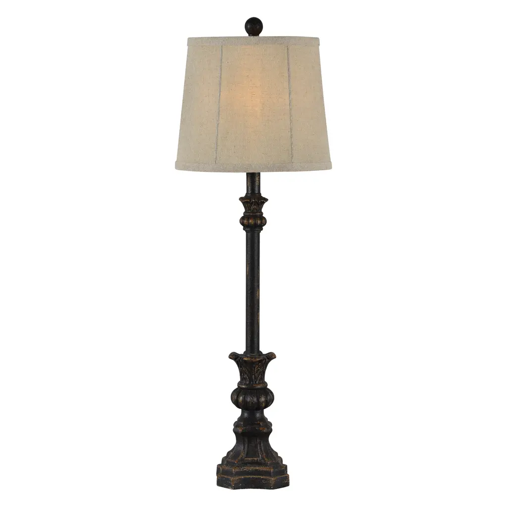 The Carlton is a classic, candlestick buffet lamp in hand-cast resin. The base features a hand-carved look with a corner-cut base. Carlton measures 32 inches high from base to finial and is hand-painted in a distressed black finish. Each lamp in this set of 2 is topped with a softback oatmeal linen blend shade and uses a 60 watt standard bulb (not included).Features: