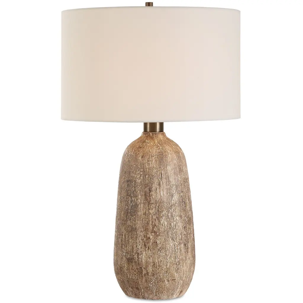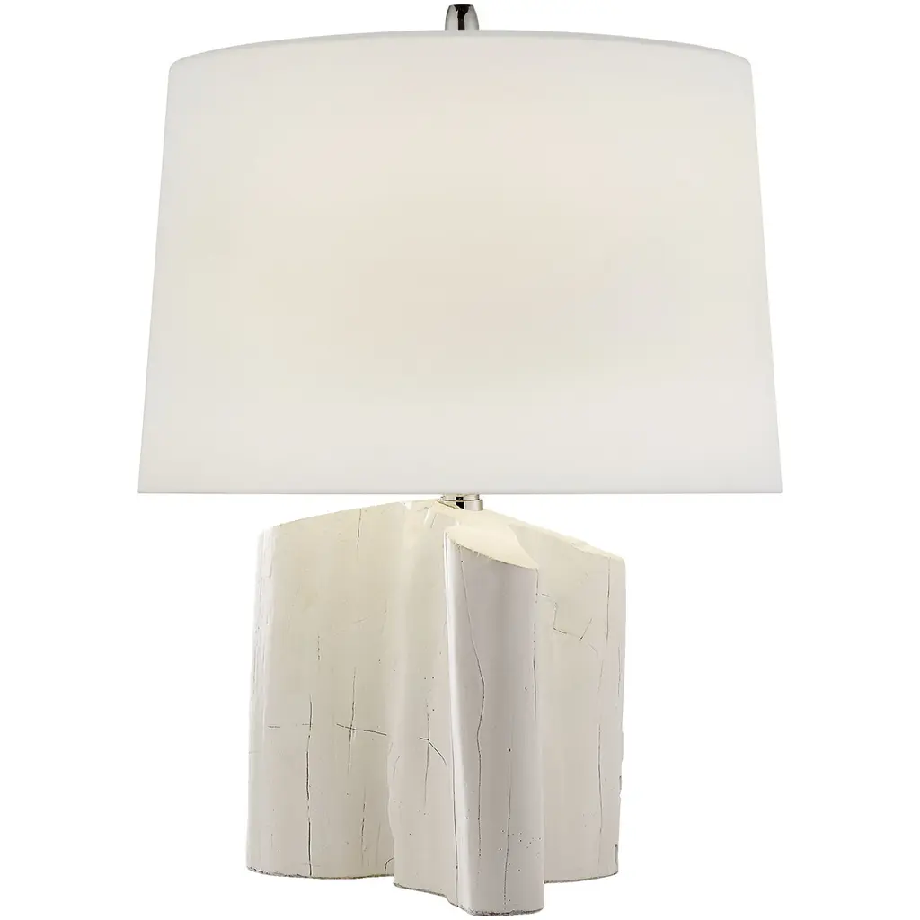 The elaborate Carmel Table Lamp by Visual Comfort Signature, formerly known as Visual Comfort, gives any space a look of uniqueness. A polyresin body is worked into an abstract shape that resembles an undulating mountainside, producing a striking visual that is neither fully rectangular nor round. A drum-like shade of natural paper rests at the lamp’s summit, extending beyond the edges of this dense fixture. Inside of this lamp rests a halogen bulb that effortlessly projects bright light throughout your home.