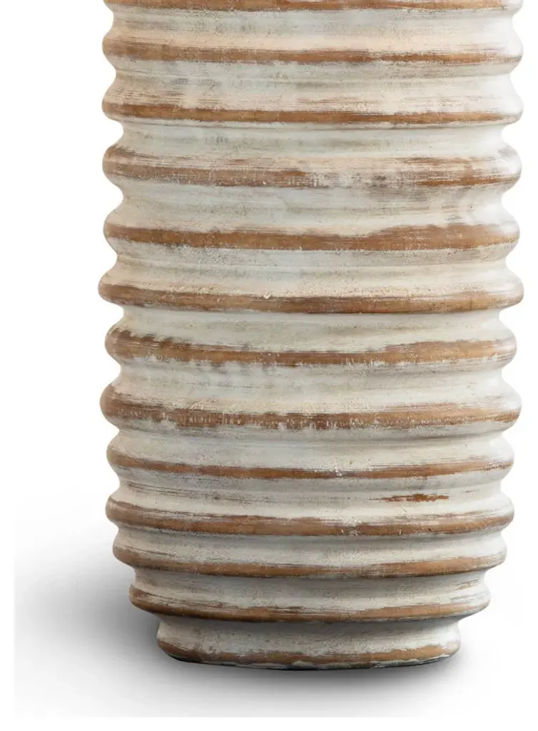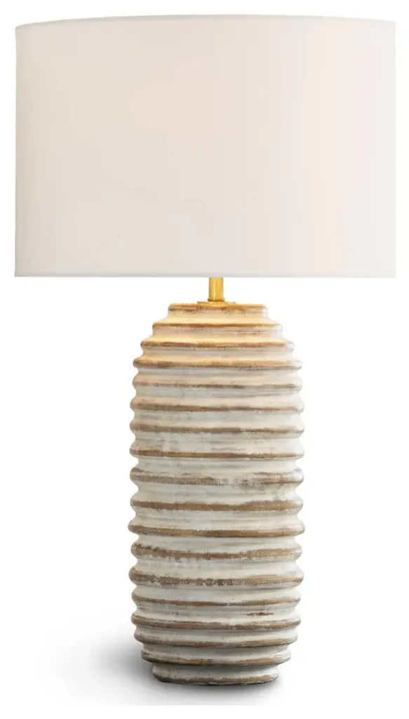 The Carmel Table Lamp''s wood body is white-washed and distressed like driftwood that has been aged by the sun and sea. Carved ridges run along the entire body of the lamp, which is topped with a large drum shade and natural brassl ball finial.Whether in a relaxed coastal retreat or a neutral bedroom getaway, the Carmel Lamp will provide both sculptural interest and beautiful, warm lighting to your space.Bulb Type: A Type Medium Base (E26)Wattage: 3-Way 150 Watt MaxNumber of Bulbs Needed: 1Bulb Included: No
