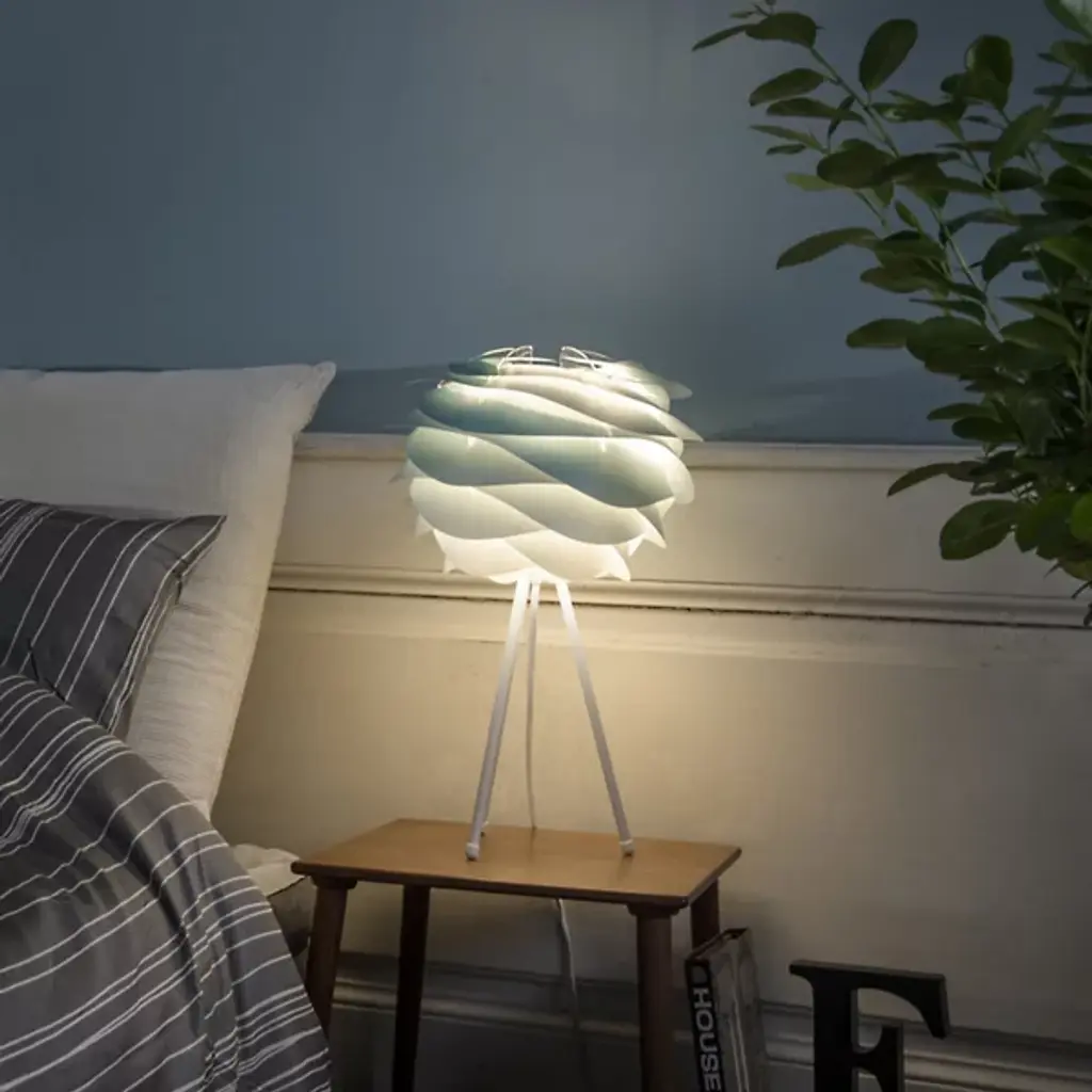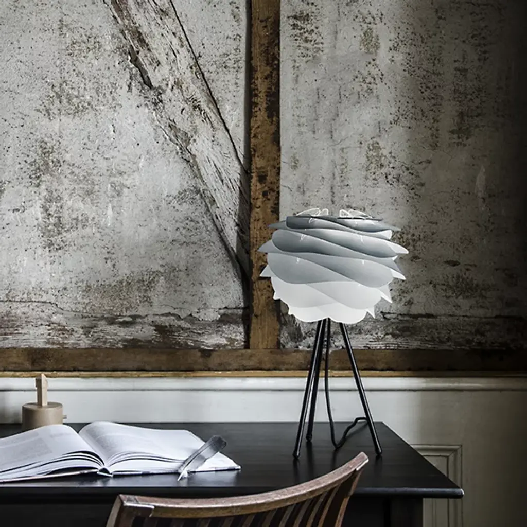 The wavy layers of the UMAGE Carmina Mini Table Lamp have a swirling quality like frosted piping, creating a fully diffused and glare-free ambient light. The layers are attached to the clear structure at an angled position, diverting the ambient light downward while keeping the bulb out of view. The shade can be placed on the tripod base in an upward or downward position, simplifying installation and giving you the option to change the look at any given time.