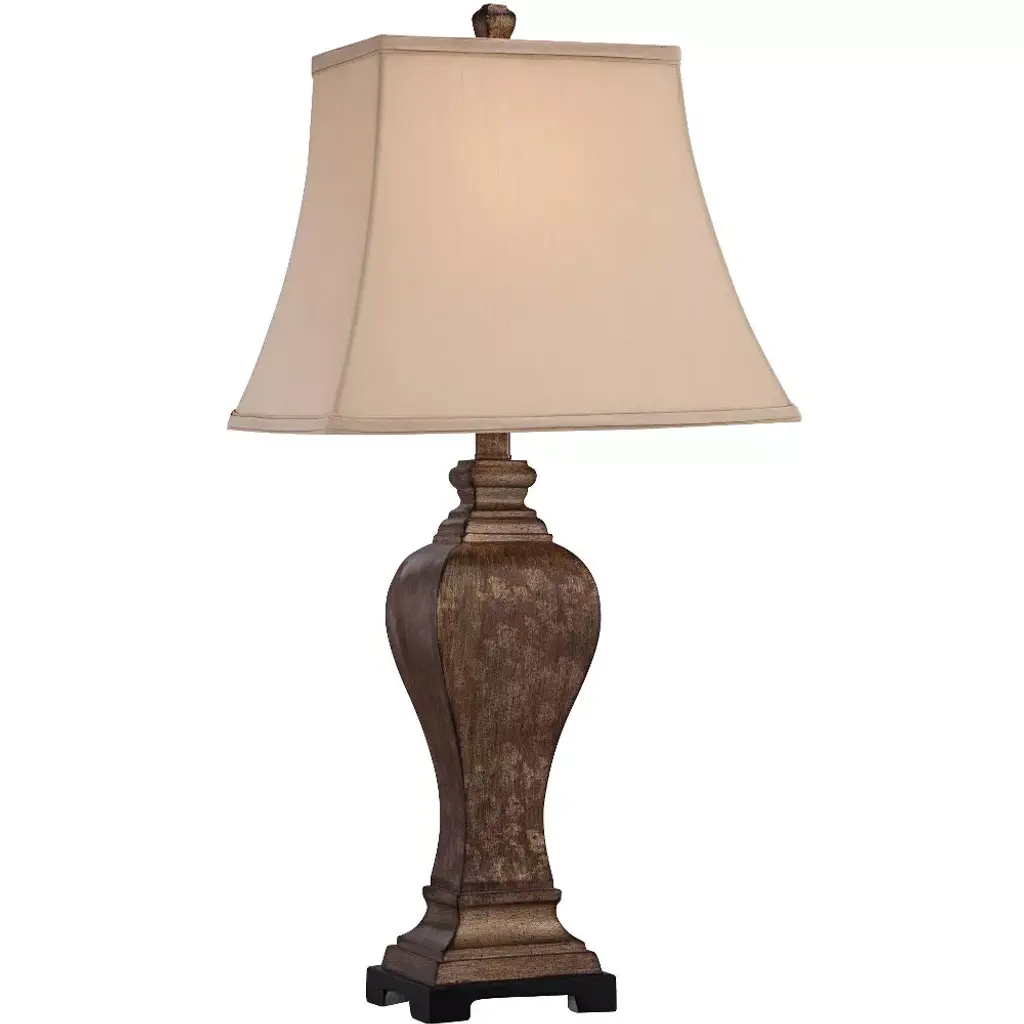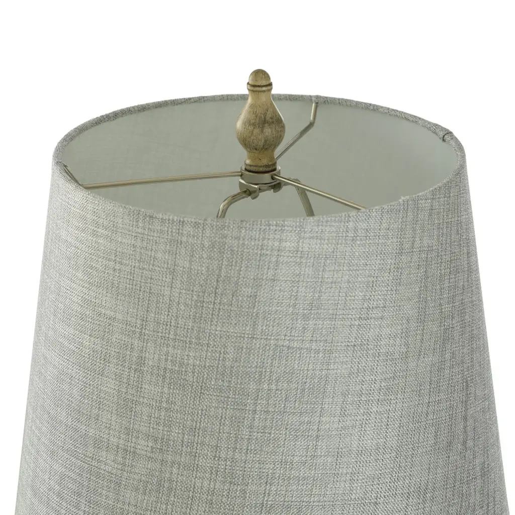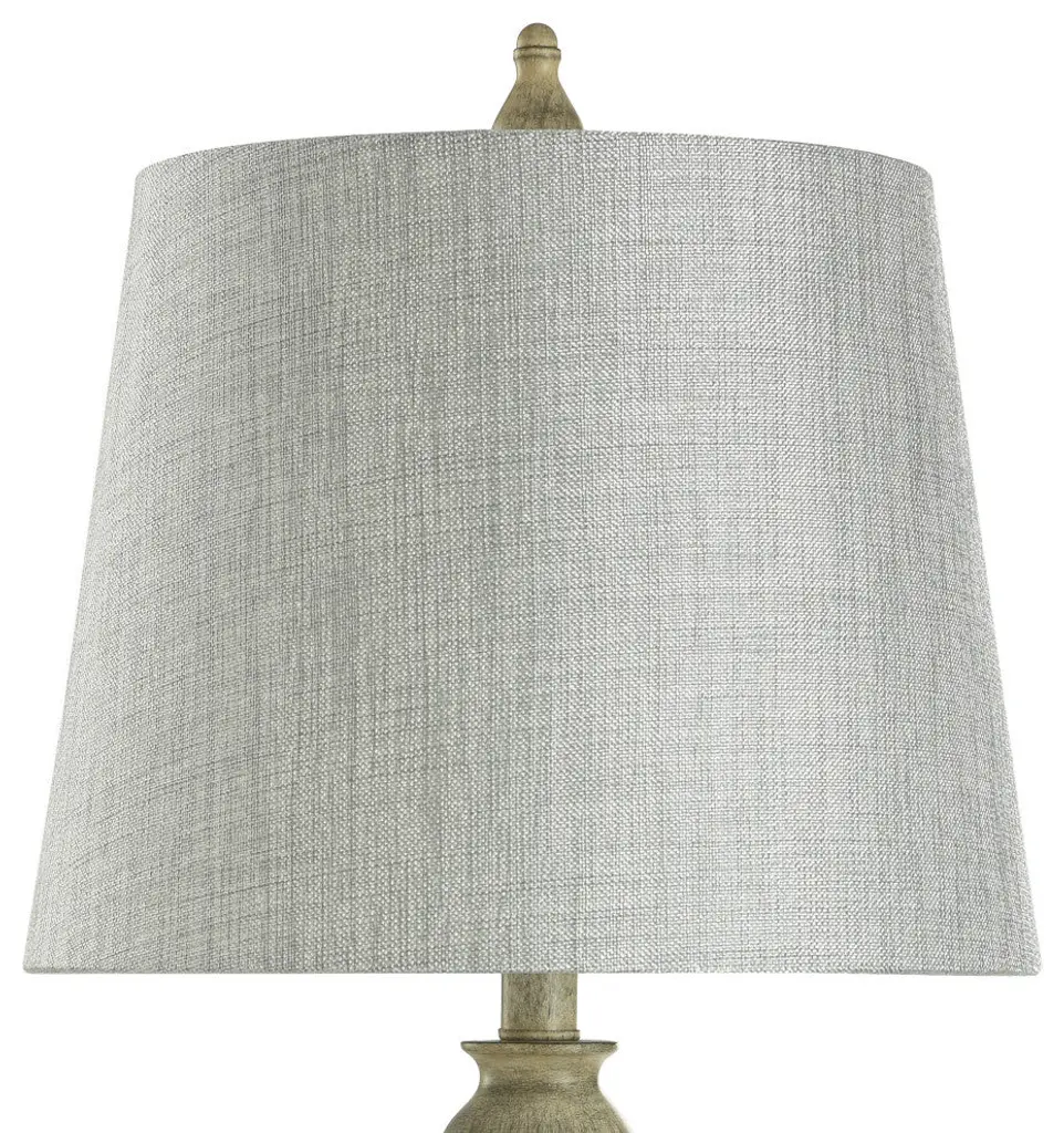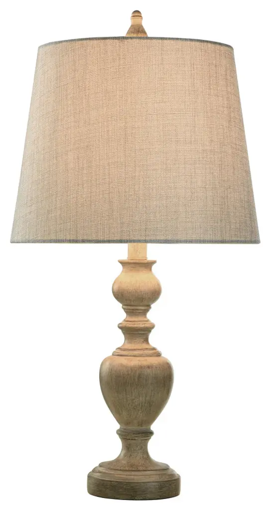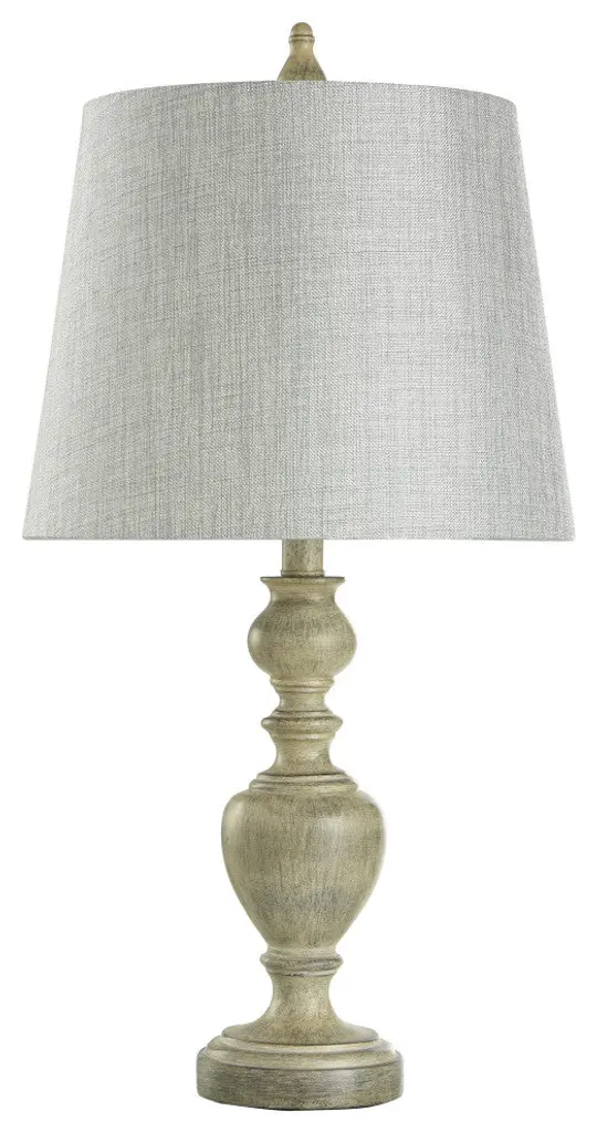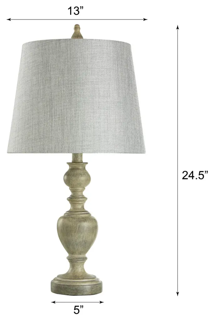 Add some charming illumination to your home with the Carol table lamp. The poly resin body, which is adorned with a metal turn knob in brush nickel, comes with a cream and distressed gray finish. A classic round, hardback shade will make this one lamp people remember when they step foot in your family room. Features: All hardware and metal turn knobs in brush nickelA handpainted finish means each piece is unique, with possible slight variations. No two lamps are exactly alike.Finish: Distressed Gray,CreamShade Finish: Gray,CreamMaterial: Poly ResinShade Material: Hardback FabricLength: 10 inchesWidth: 13 inchesHeight: 25 inchesVoltage: 120VWattage: 60Safety Rating: Dry Location - This item is rated for dry locations, meaning it can be used in an indoor area that is not normally subject to dampness. May include a location subject to temporary dampness provided ventilation is adequate to prevent any accumulation of moisture such as the bathroomBulb(s) Included: NoBulb Type: IncandescentNumber of Bulbs: 1Due to lighting and monitor differences, actual colors and finishes may vary slightly from what appears online.