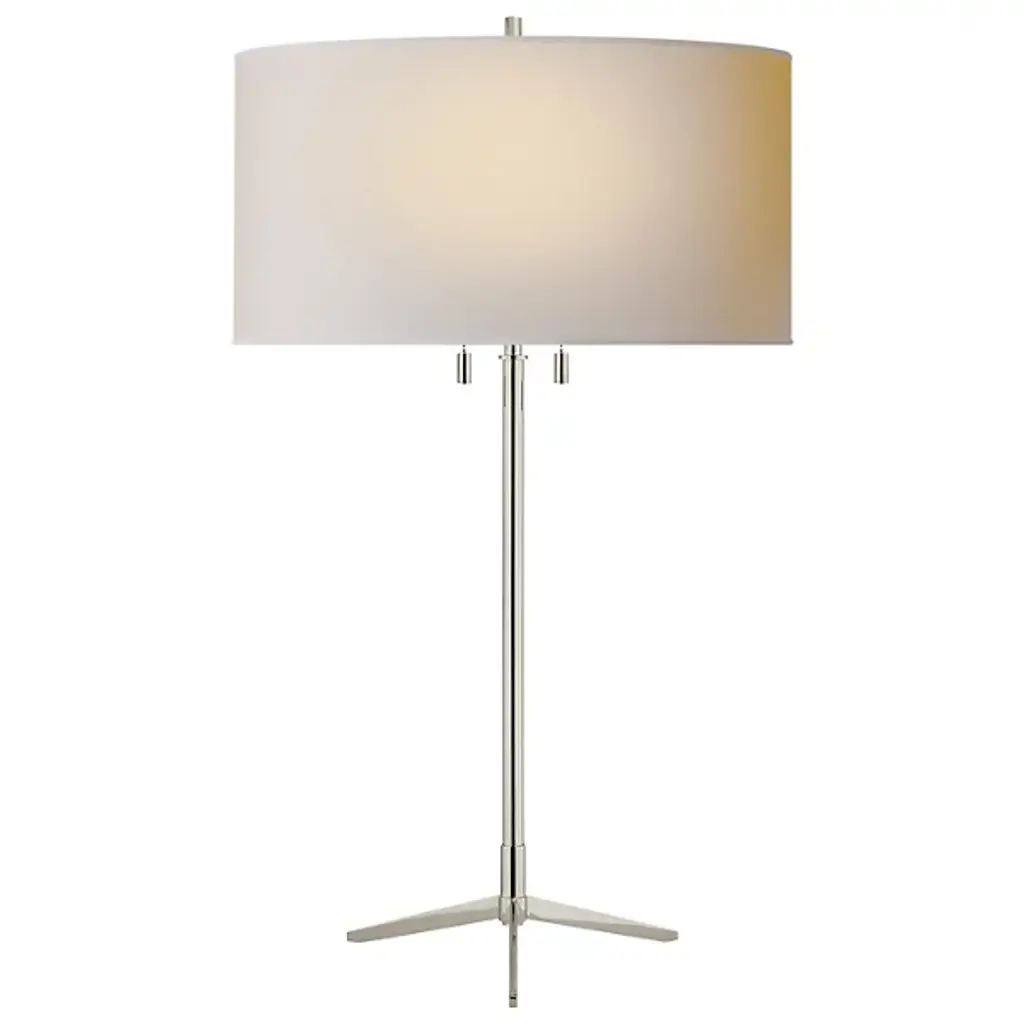 The Caron Table Lamp by Visual Comfort Signature, formerly known as Visual Comfort, features simple, yet elegant lines and design-minded style. A Natural Paper drum shade brilliantly distributes ambient and direct light throughout the surrounding space. Two independent pull-chain switches allow for user control of each lamp that rests above. A 10-inch tripod base offers stability and finishes out the fixture. Designed by Thomas O’Brien.