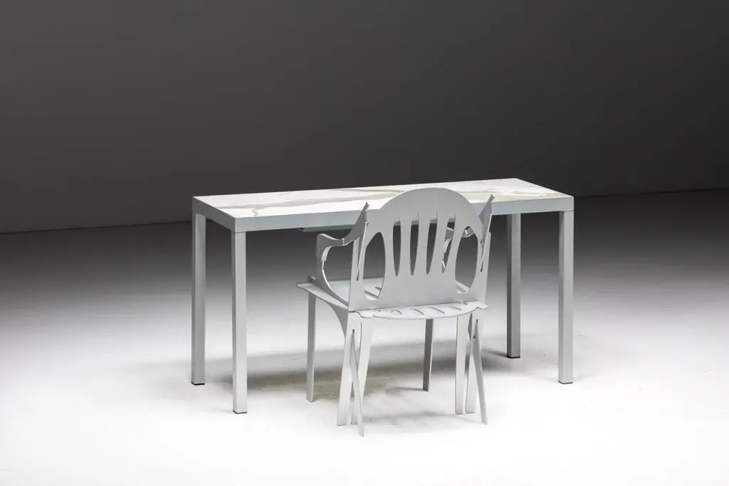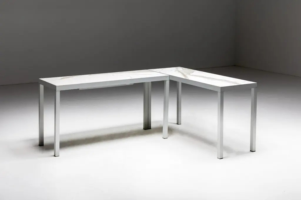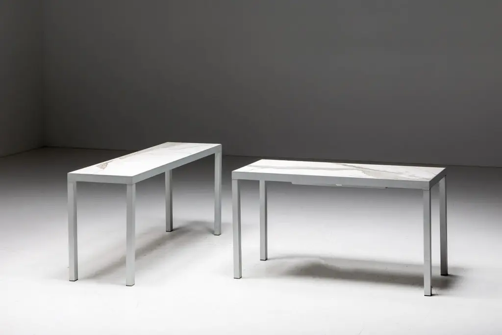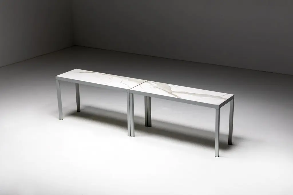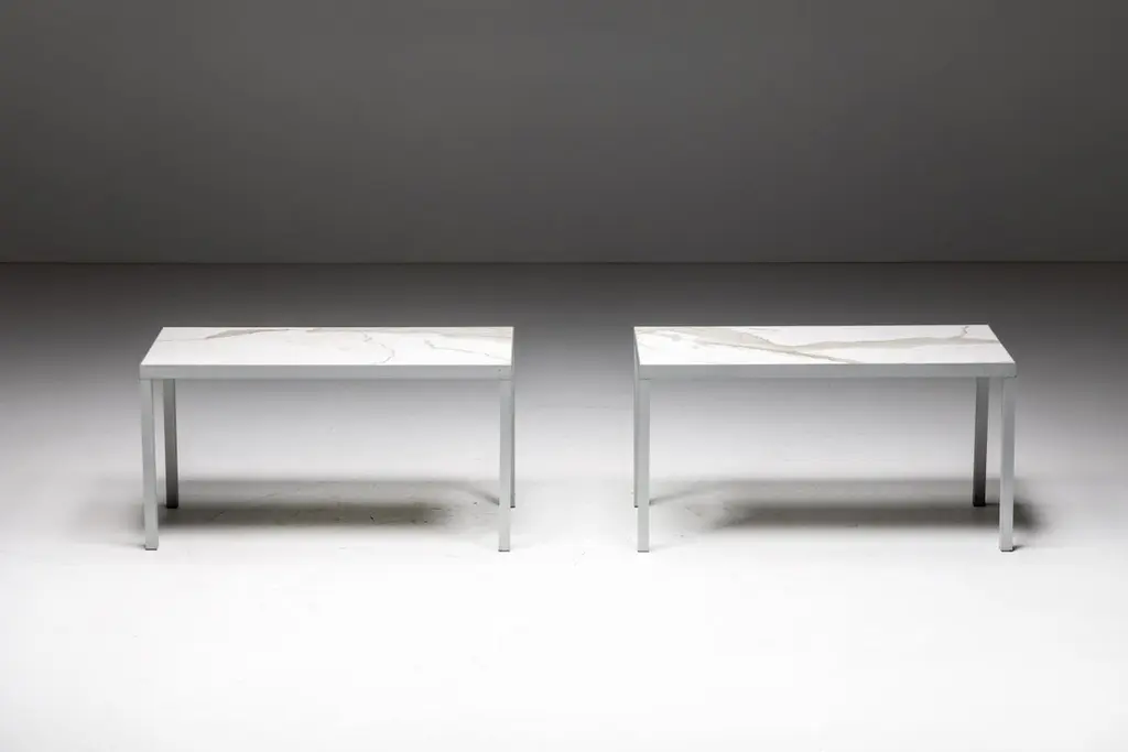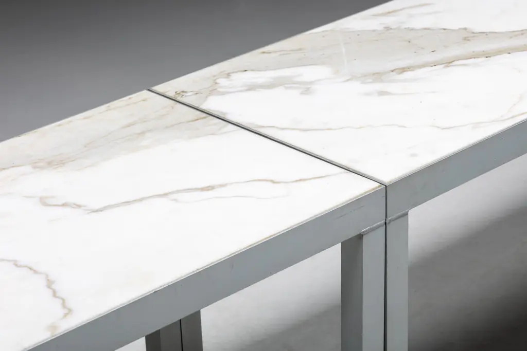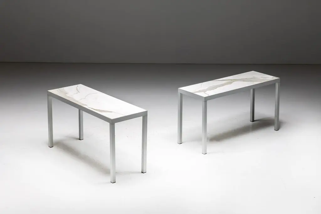 Carrara marble console table designed by Philippe Starck. Crafted with precision and finesse, this exquisite piece exudes sophistication and luxury. Whether gracing your living room to showcase your cherished curiosities or adorned with a beautiful table lamp, this Carrara marble console table adds a touch of timeless sophistication. Its versatile design also makes it a stunning statement piece for your hallway, setting the tone for elegance as you enter your home. With two available, these console tables are a coveted addition to any living space and are priced per piece.