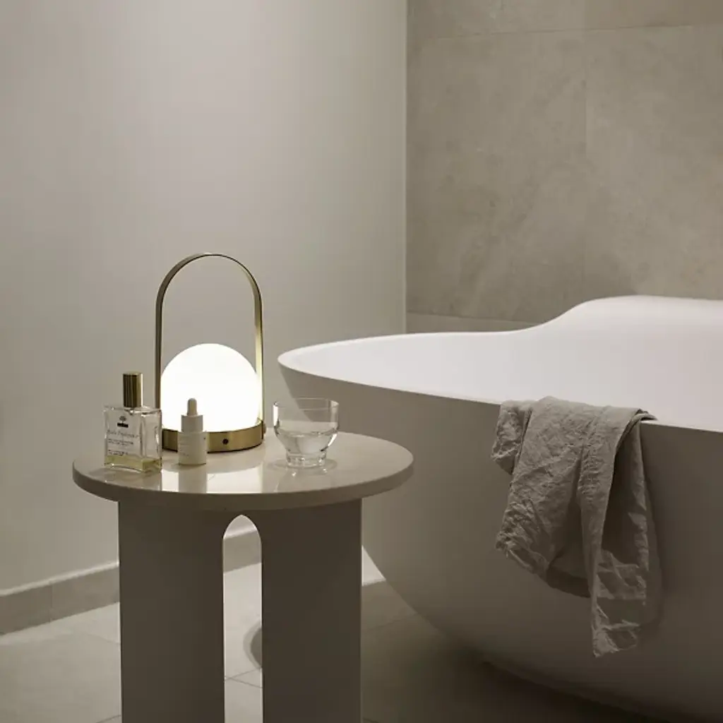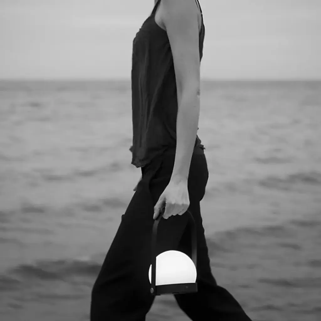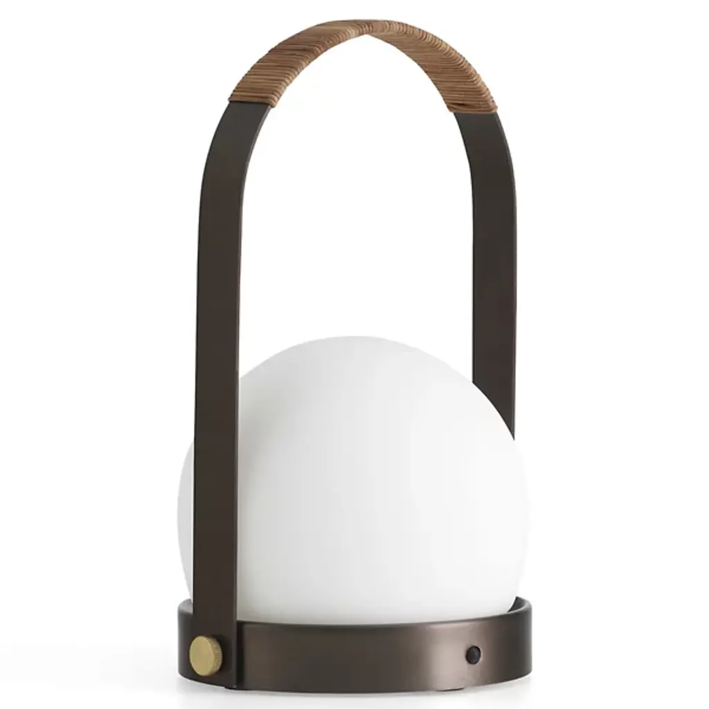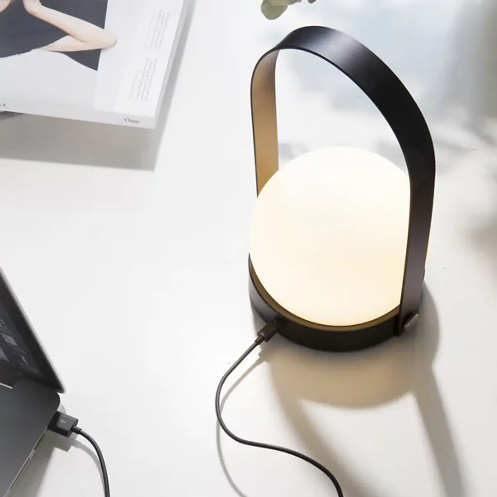 The Carrie Rechargeable LED Table Lamp from Audo Copenhagen, formerly known as Menu, is a fixture that delivers an aura of warm, pleasant comfort. Designed by Danish-based design studio Norm Architects, the fixture reflects the company's philosophy of creating a warm atmosphere through the means of a streamlined, minimalist Opal Glass Shade and powder-coated steel frame. It refines a minimalist hygge style warmth and charges using an included USB cable and adapter, while the handle makes it easily portable when more light is called for in any location.