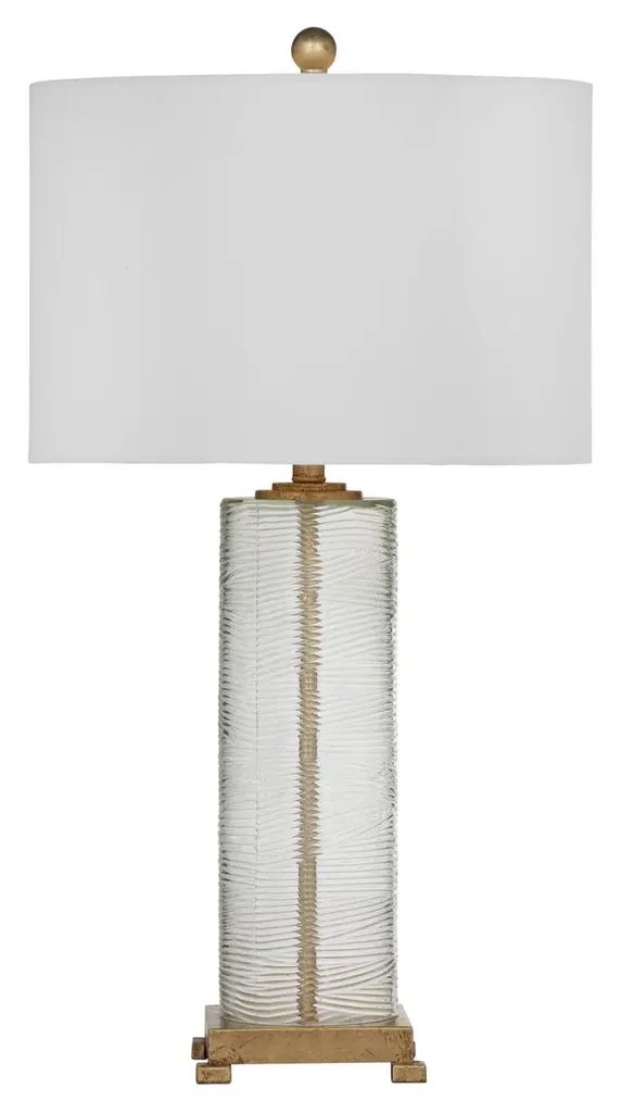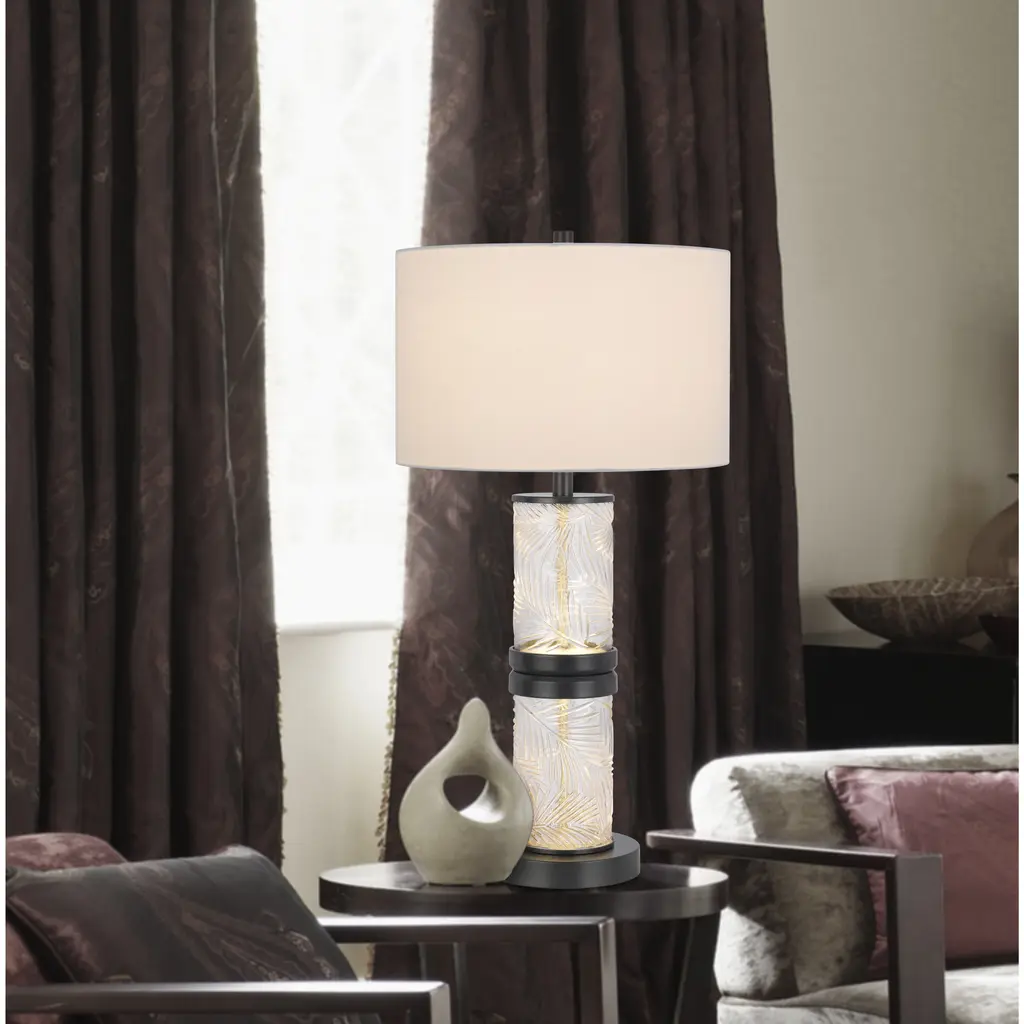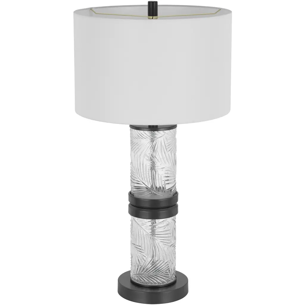 This glass cylinder table lamp is a great addition to your space. It features a leaf pattern textured glass set on a grey metal base . It's simple yet elegant design makes it a versatile accessory which works well with many different styles and decor.