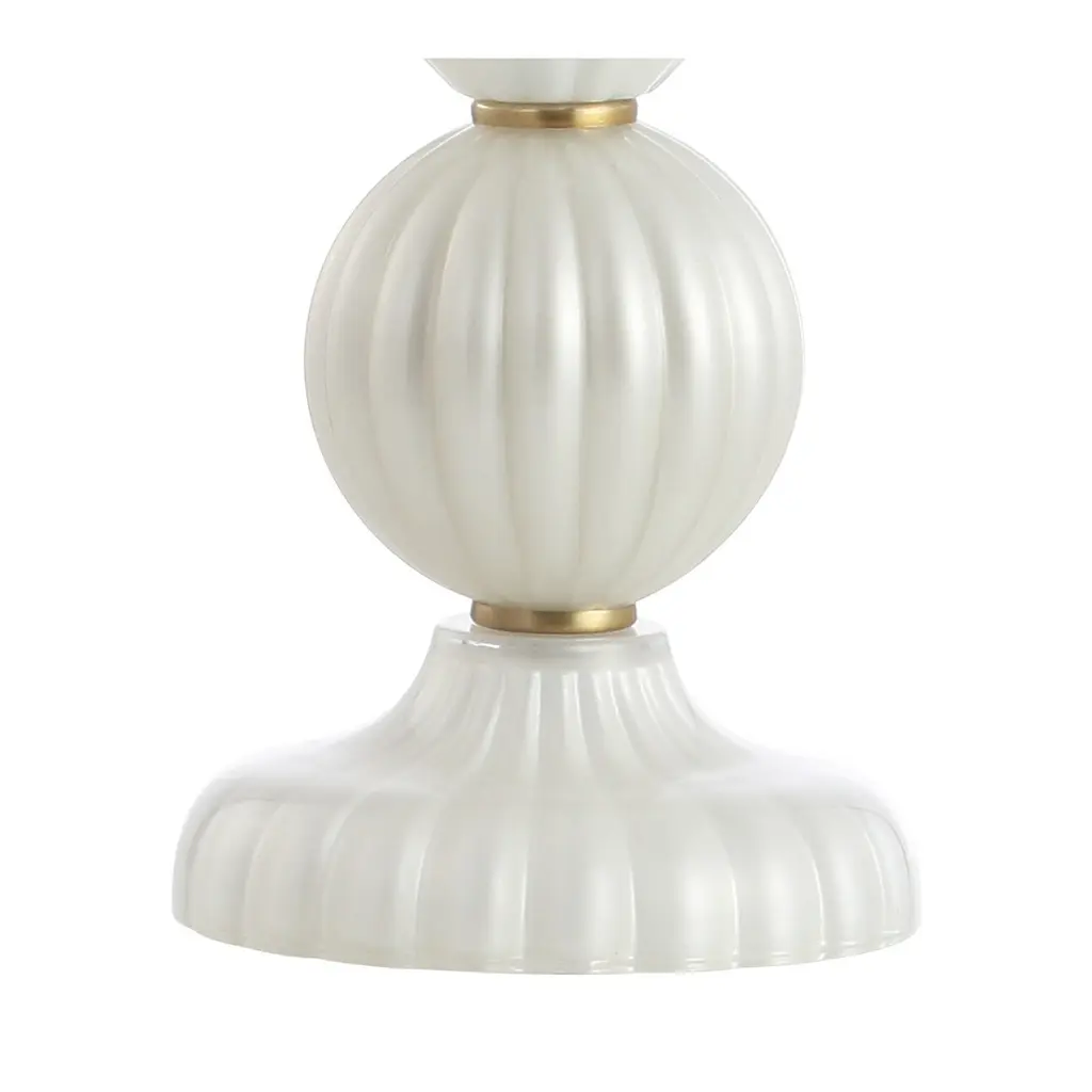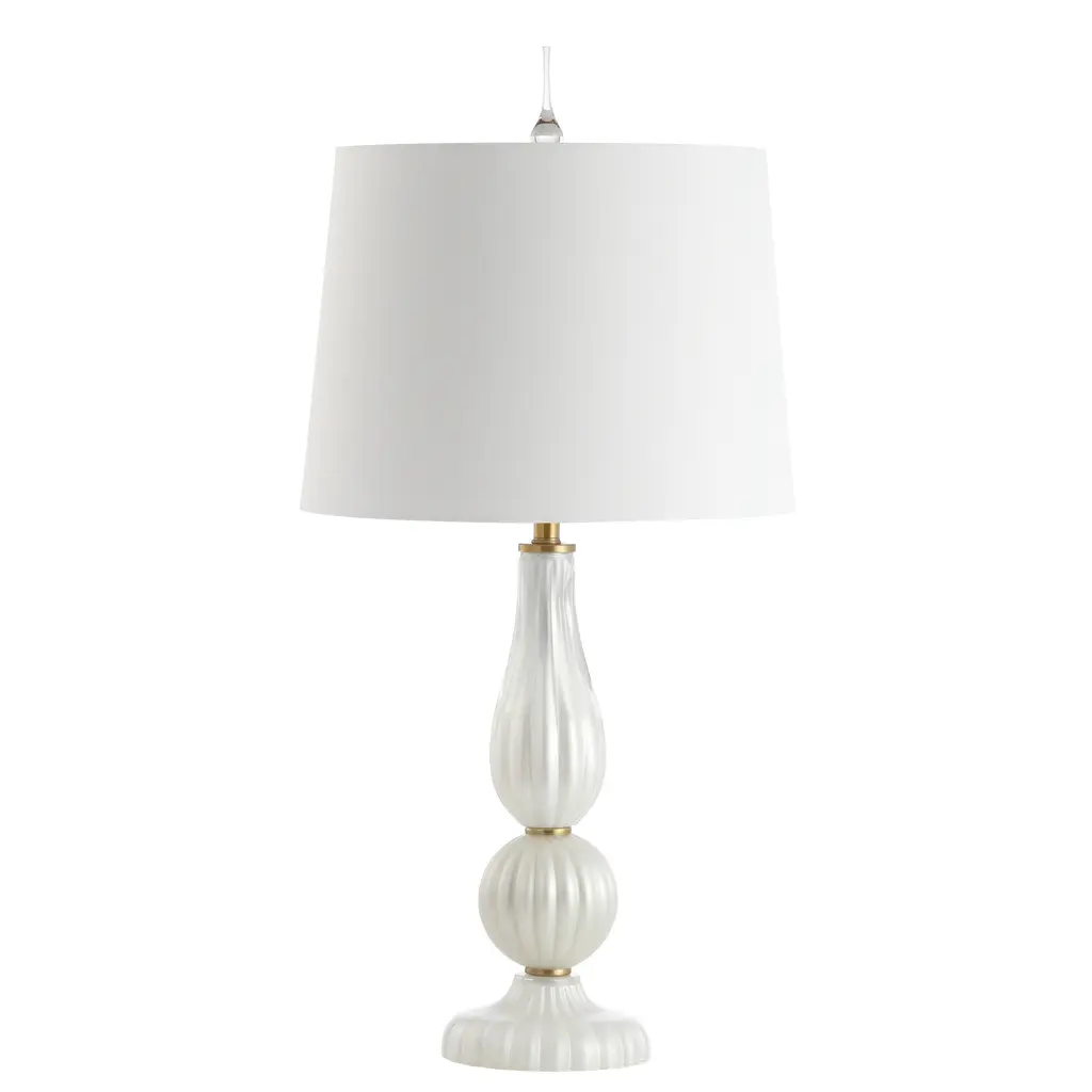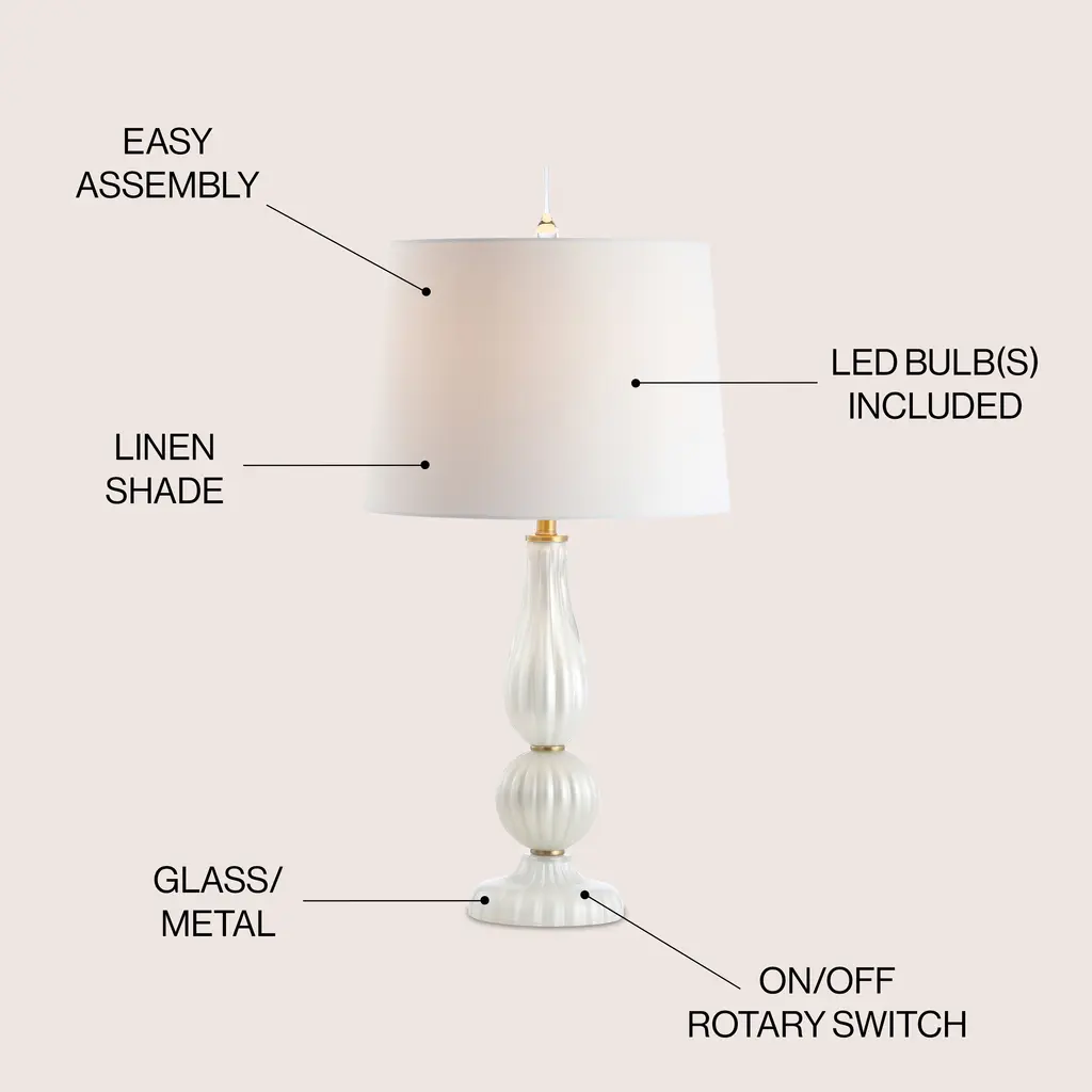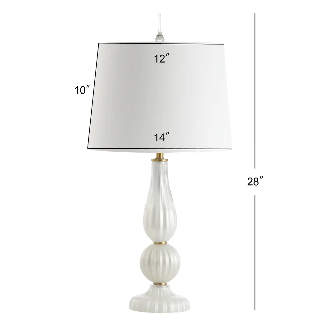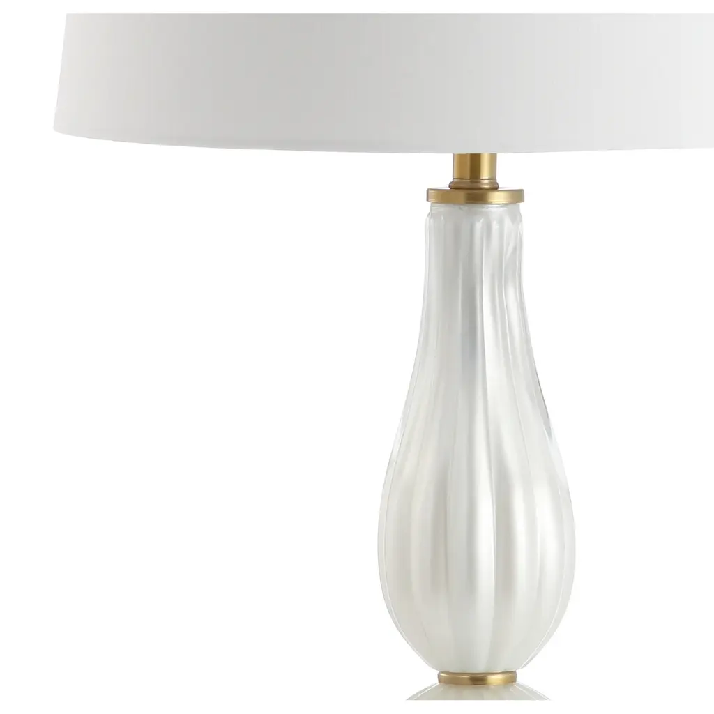 The classic gourd lamp gets an elegant update with the addition of narrow fluting on this beautiful base. Inspired by a Venetian design from an Italian antiques market, its glass construction features an iridescent white finish that will brighten your favorite hideaway. A classic, white cotton drum shade adds an elegant finishing touch, especially once topped with a decorative crystal finial.Features:Dimensions:About us:You see a lamp.We see a decorative work of art.A perfectly curved shade casts a dramatic shadow on a floor. A silk cord you never want to hide. LED lightbulbs: as easy on the environment as they are on the eyes. The JONATHAN Y Lighting collection considers every detail from impeccably sourced materials to designer styling. And our prices are so attractive, we've transformed a functional necessity into a fashion accessory.JONATHAN Y Lighting - a fashion revolution in home decor.