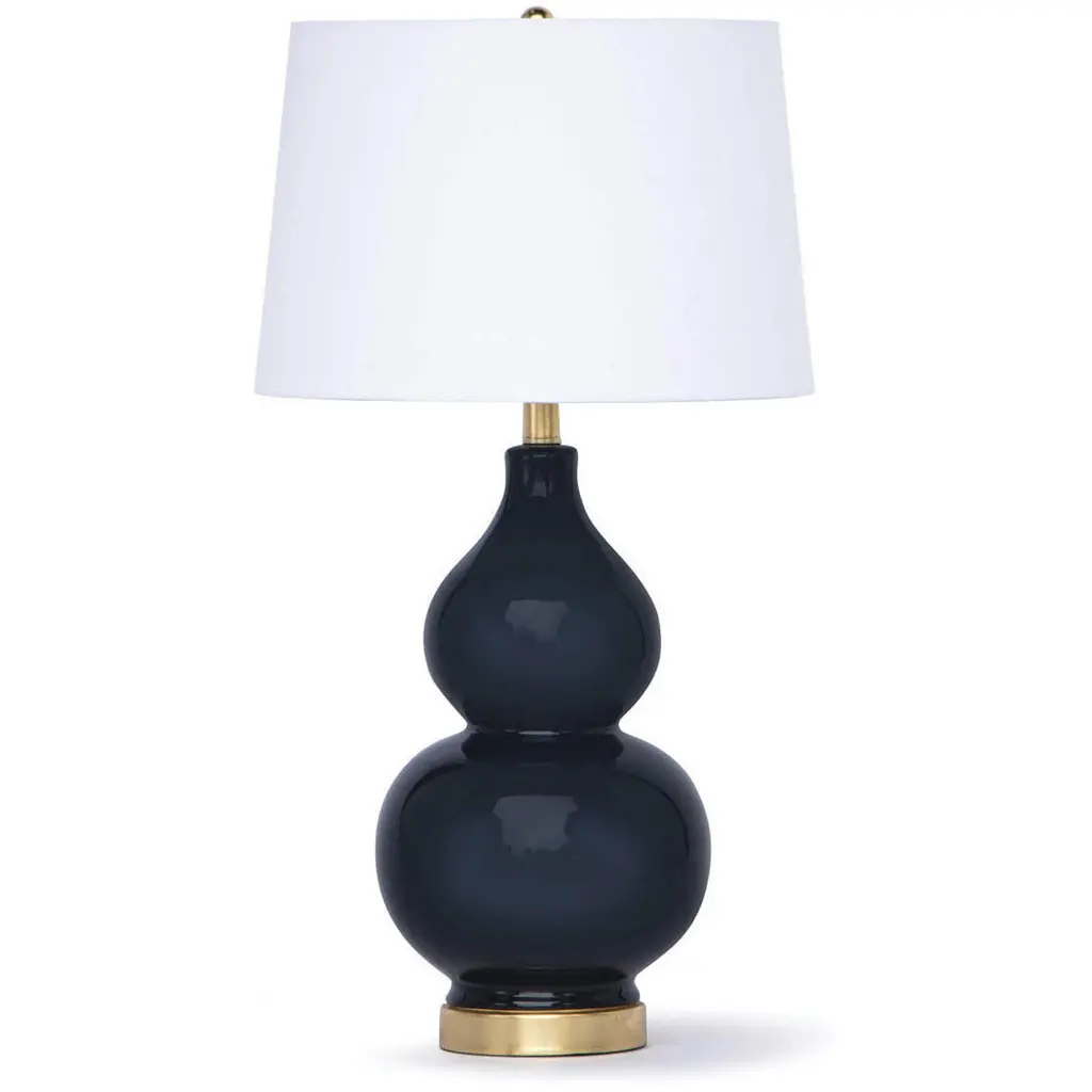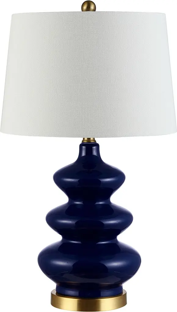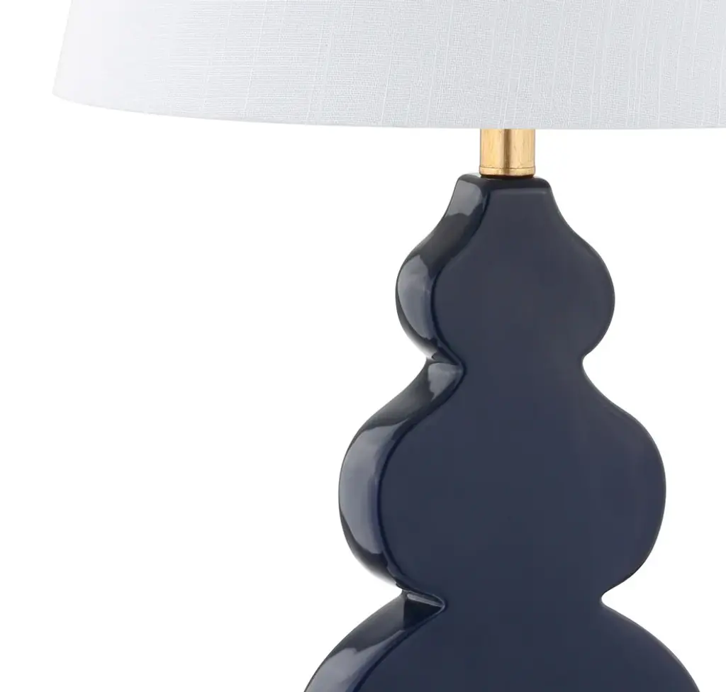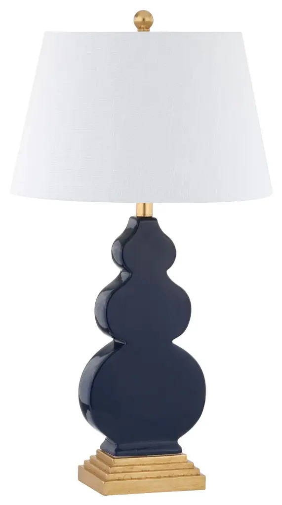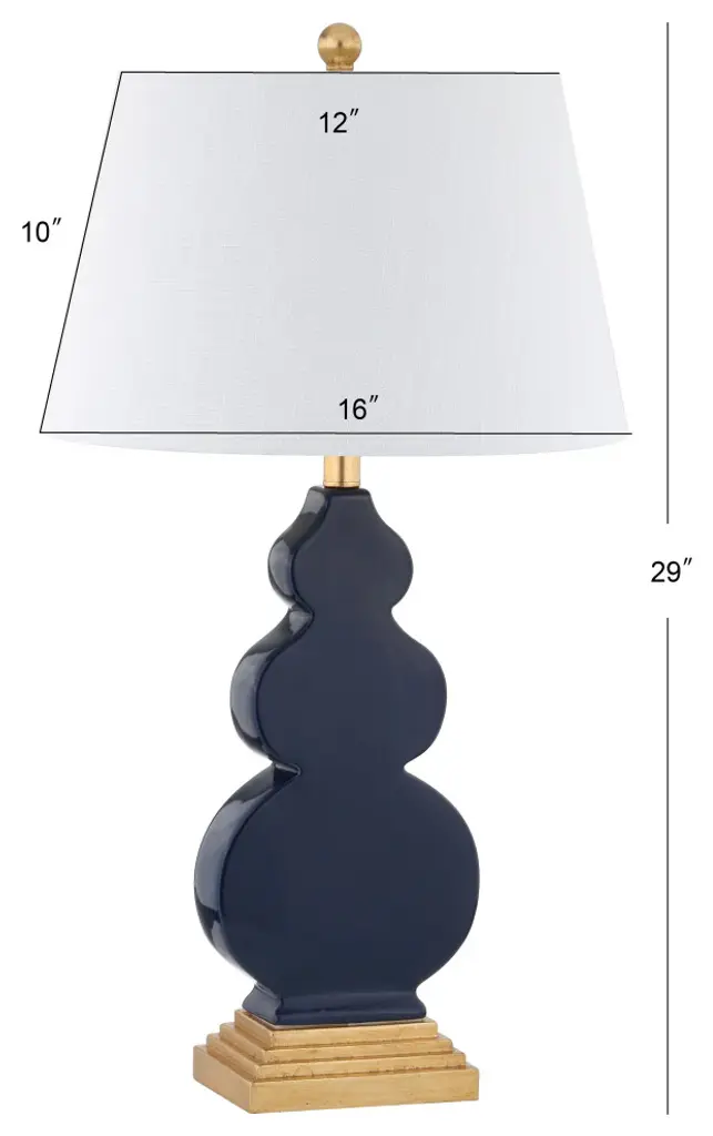 This beautiful tapered triple gourd base ceramic table lamp will brighten up your home with the elegance of contemporary style. Modernized from the midcentury classic by a revised shape that is flat on two sides but retains the classic curves of the original, the look is completed by a gold leaf stepped pedestal base. Finished in a glossy navy blue glaze, it is topped with a slightly tapered cotton linen drum shade and gold finial.-The classic triple gourd lamp gets a contemporary update when flattened on two sides while maintaining its iconic silhouette-100% cotton hardback drum shade in white-Beautiful to display or easy to conceal: the 60" cord is silk-wrapped-On-off rotary switch on socket-Takes one bulb and compatible with any 12W LED or 100W incandescent or 23W CFL-Eco-friendly 9W LED bulb included-UL Listed-Color: Navy/Gold with white shade-Body Material: Ceramic / Resin-Base Material: Iron-Finial Material: Resin-Finial Color: Gold Leaf-Harp Color: Gold-Includes: One (1) lamp(s)-Minor Assembly Required-Lamp: 29 inches high x 16 inches wide x 16 inches deep-Shade: 10 inches high x 16 inches wide x 16 inches deepYou see a lamp.We see a decorative work of art.A perfectly curved shade casts a dramatic shadow on a floor. A silk cord you never want to hide. LED lightbulbs: as easy on the environment as they are on the eyes. The JONATHAN Y Lighting collection considers every detail from impeccably sourced materials to designer styling. And our prices are so attractive, we''ve transformed a functional necessity into a fashion accessory.JONATHAN Y Lighting - a fashion revolution in home decor.
