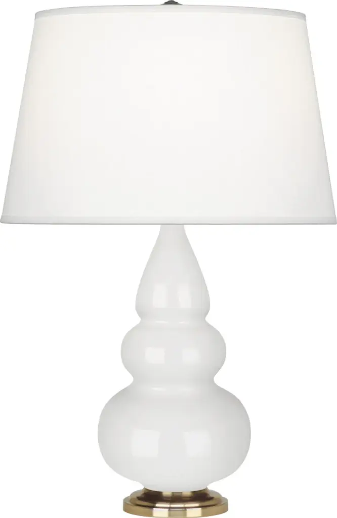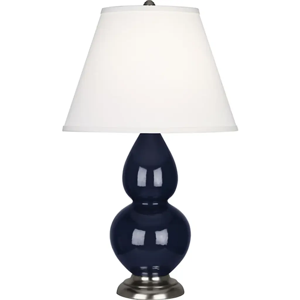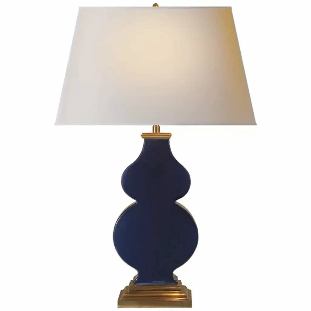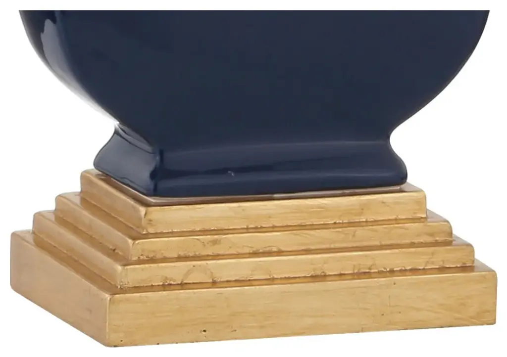 This beautiful tapered triple gourd base ceramic table lamp will brighten up your home with the elegance of contemporary style. Modernized from the midcentury classic by a revised shape that is flat on two sides but retains the classic curves of the original, the look is completed by a gold leaf stepped pedestal base. Finished in a glossy navy blue glaze, it is topped with a slightly tapered cotton linen drum shade and gold finial.-The classic triple gourd lamp gets a contemporary update when flattened on two sides while maintaining its iconic silhouette-100% cotton hardback drum shade in white-Beautiful to display or easy to conceal: the 60" cord is silk-wrapped-On-off rotary switch on socket-Takes one bulb and compatible with any 12W LED or 100W incandescent or 23W CFL-Eco-friendly 9W LED bulb included-UL Listed-Color: Navy/Gold with white shade-Body Material: Ceramic / Resin-Base Material: Iron-Finial Material: Resin-Finial Color: Gold Leaf-Harp Color: Gold-Includes: One (1) lamp(s)-Minor Assembly Required-Lamp: 29 inches high x 16 inches wide x 16 inches deep-Shade: 10 inches high x 16 inches wide x 16 inches deepYou see a lamp.We see a decorative work of art.A perfectly curved shade casts a dramatic shadow on a floor. A silk cord you never want to hide. LED lightbulbs: as easy on the environment as they are on the eyes. The JONATHAN Y Lighting collection considers every detail from impeccably sourced materials to designer styling. And our prices are so attractive, we''ve transformed a functional necessity into a fashion accessory.JONATHAN Y Lighting - a fashion revolution in home decor.