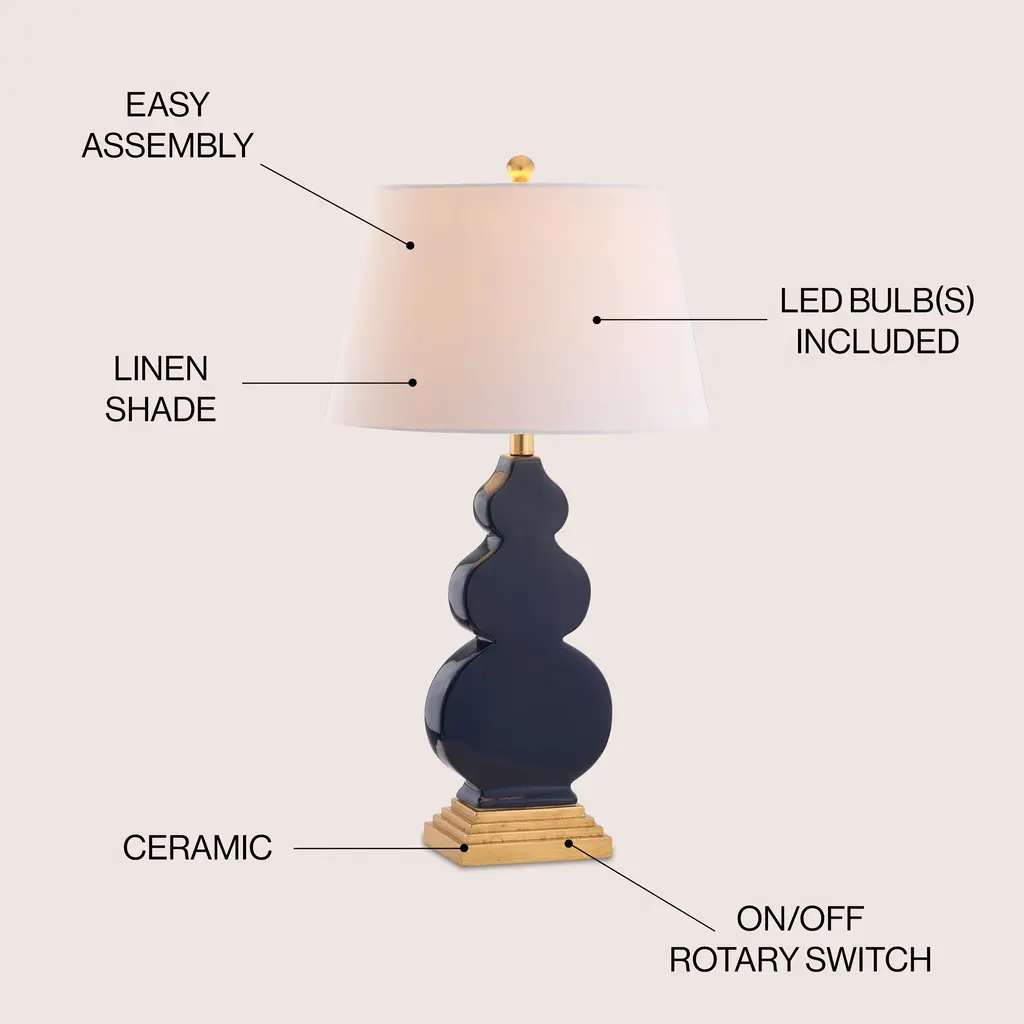 This beautiful tapered triple gourd base ceramic table lamp will brighten up your home with the elegance of contemporary style. Modernized from the midcentury classic by a revised shape that is flat on two sides but retains the classic curves of the original, the look is completed by a gold leaf stepped pedestal base. Finished in a glossy navy blue glaze, it is topped with a slightly tapered cotton linen drum shade and gold finial.Features:Dimensions:About us:You see a lamp.We see a decorative work of art.A perfectly curved shade casts a dramatic shadow on a floor. A silk cord you never want to hide. Compatible with LED lightbulbs: as easy on the environment as they are on the eyes. The JONATHAN Y Lighting collection considers every detail from impeccably sourced materials to designer styling. And our prices are so attractive, we've transformed a functional necessity into a fashion accessory.JONATHAN Y Lighting - a fashion revolution in home decor.