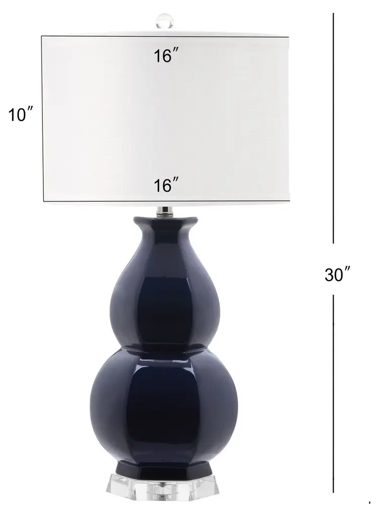 Faceted detailing and a transparent acrylic base give modern panache to this classic double-gourd lamp. This striking lamp is finished with a textured white cotton drum shade and modern acrylic pedestal and finial, offering a fashion update to a timeless design.