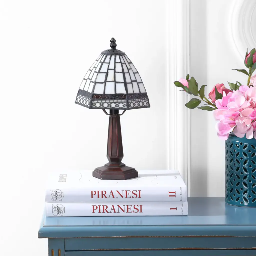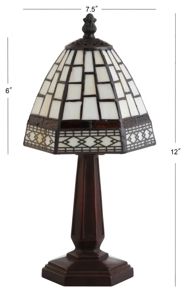 Add a touch of classic elegance to the tables in your living room with this lovely Tiffany-inspired table lamp. Warm shades of ivory imbued into each glass piece provide soft ambient light, punctuated with a geometric amber border, which casts a beautiful pattern on the surrounding walls. While inspired by traditional design, this piece is updated with the functionality expected today -- an on/off switch at the top of the silk-wrapped cord and LED bulb compatibility.-Elegant shade design in shades of ivory and amber.-Handcrafted stained glass shade soldered with metal. -Beautiful to display or easy to conceal: the 60" cord is silk-wrapped.-On-off in-line switch-Takes one maximum 25-watt incandescent bulb, 9 watt CFL bulb, or 5 watt LED bulb (one LED bulb included).-Eco-friendly 4W LED bulb included-UL Listed-Color: Multi with brown base-Body Material: Resin-Base Material: Metal-Finial Material: Metal-Finial Color: Brown-Harp Color: Brown-Includes: One (1) lamp(s)-Minor Assembly Required-Lamp: 12 inches high x 7.5 inches wide x 7.5 inches deep-Shade: 6 inches high x 7.5 inches wide x 7.5 inches deepYou see a lamp.We see a decorative work of art.A perfectly curved shade casts a dramatic shadow on a floor. A silk cord you never want to hide. LED lightbulbs: as easy on the environment as they are on the eyes. The JONTHAN Y Lighting collection considers every detail from impeccably sourced materials to designer styling. And our prices are so attractive, we''ve transformed a functional necessity into a fashion accessory.JONATHAN Y Lighting a fashion revolution in home decor.