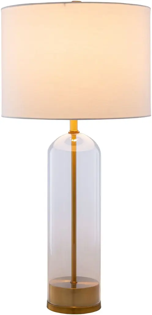 The juxtaposition of the clear glass body and the golden base makes this table lamp a welcome addition to traditional, eclectic, and contemporary spaces alike.