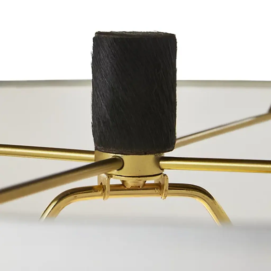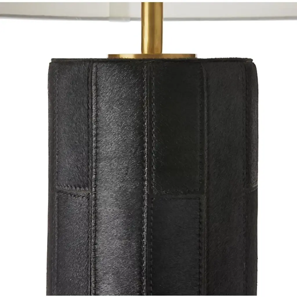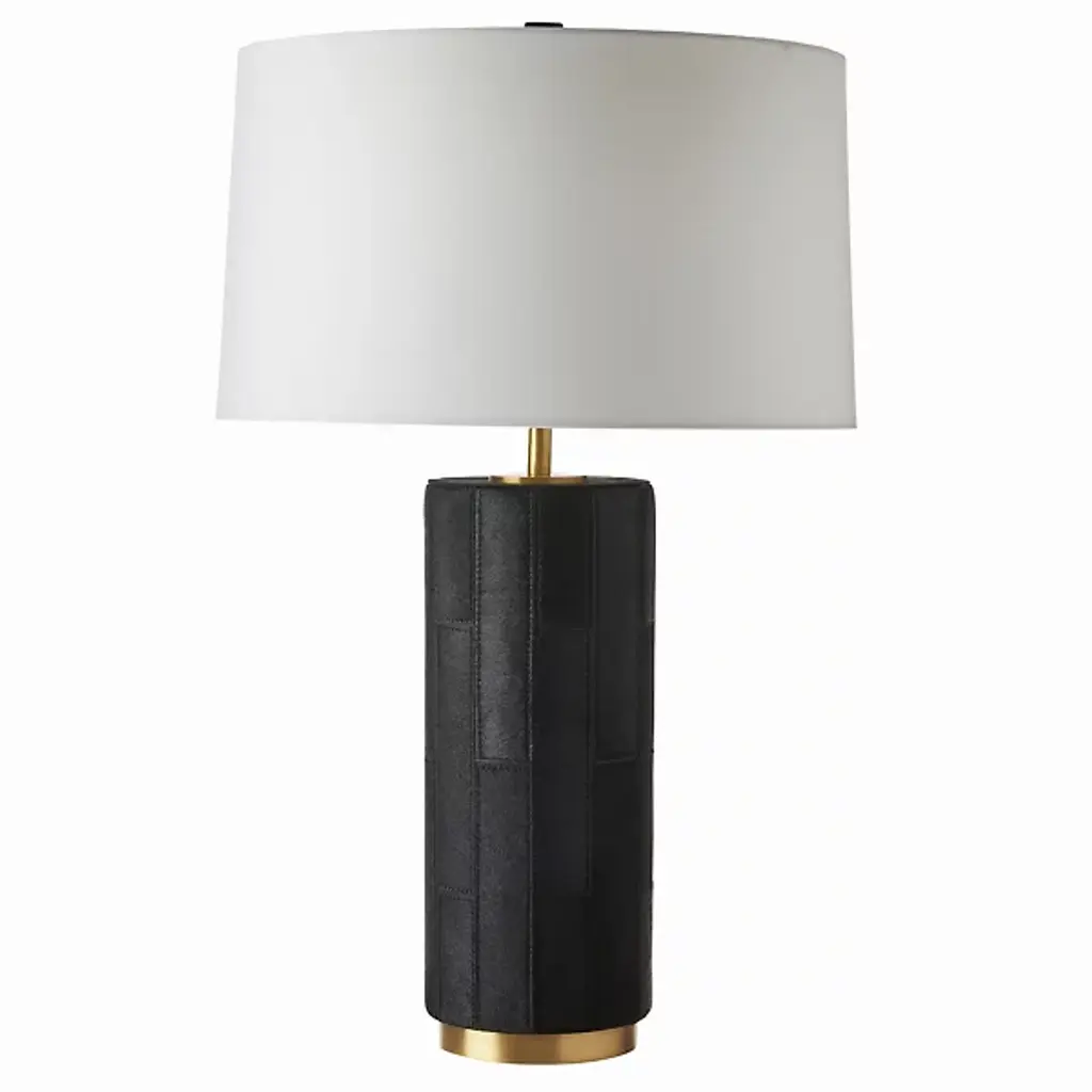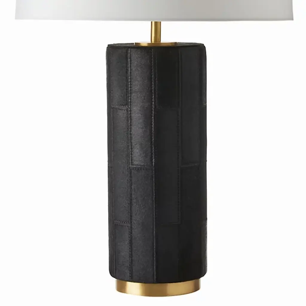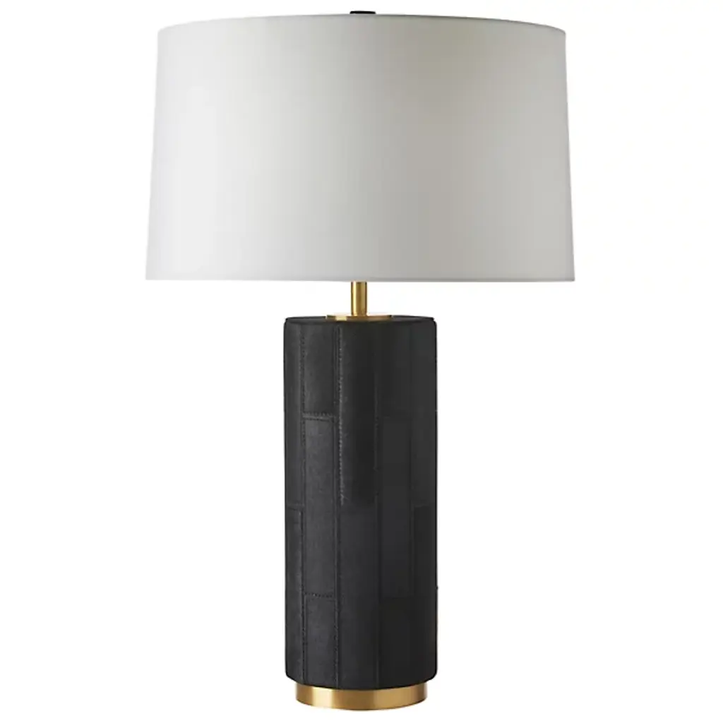 The Cartwright Table Lamp from Arteriors embodies a luxurious Hollywood Regency vibe. It features a minimalist silhouette elevated by intricately patchworked black hair-on-hide. The meticulously topstitched black column rests elegantly on an antique brass inset base, creating a striking visual balance. Complemented by a matching hide finial and an off-white cotton drum shade, this piece exudes sophistication and style. Each lamp is unique, with variations in the finish adding charm and character.