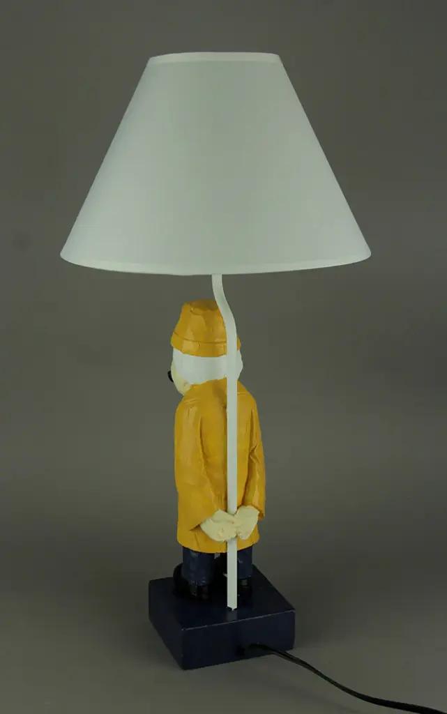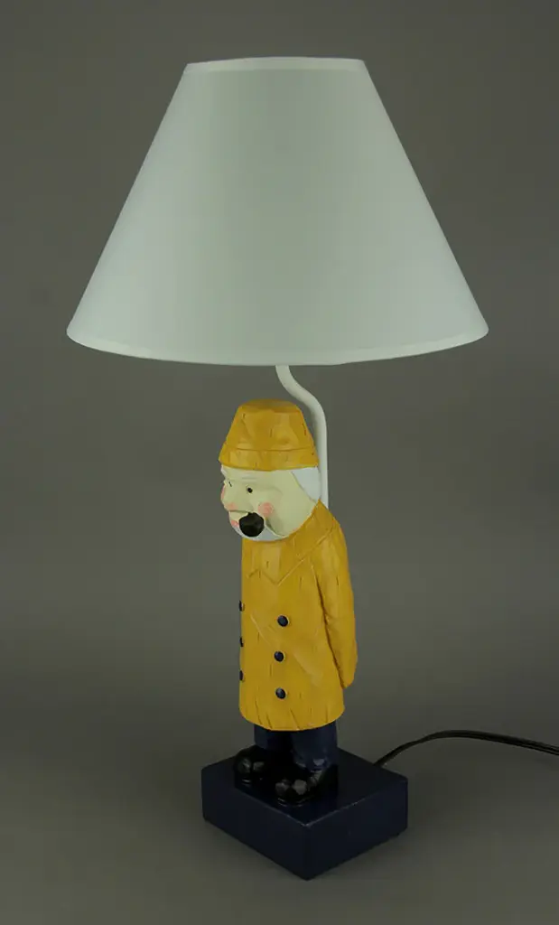 OVERALL SIZE - Measures 23 Inches High, 12 Inches In DiameterMade of Metal and PolyresinUL Approved and Accepts (1) Type A Bulb Up to 40 Watts (Not Included)5 ft. Cord with Thumb Wheel On/Off Switch120V 60Hz AC OnlyThis table lamp is the perfect accent to rooms with a nautical or coastal theme. It features a carved wood look sea captain in a bright yellow raincoat, a pipe clenched firmly in his teeth. The lamp measures 23 inches tall with a 5 inch by 4.75 inch base, and has a 12 inch diameter linen shade. It has a 5 foot long black power cord with a thumb wheel on/off switch, and uses up to 40 watt (max) type `A` bulbs (not included). The lamp is hand painted, has the look of a hand-carved wooden piece, and is sure to be admired.