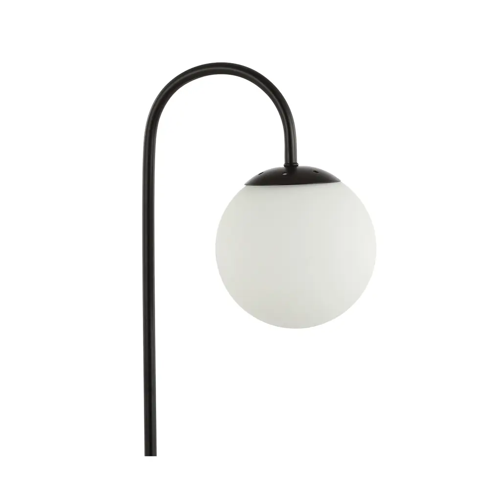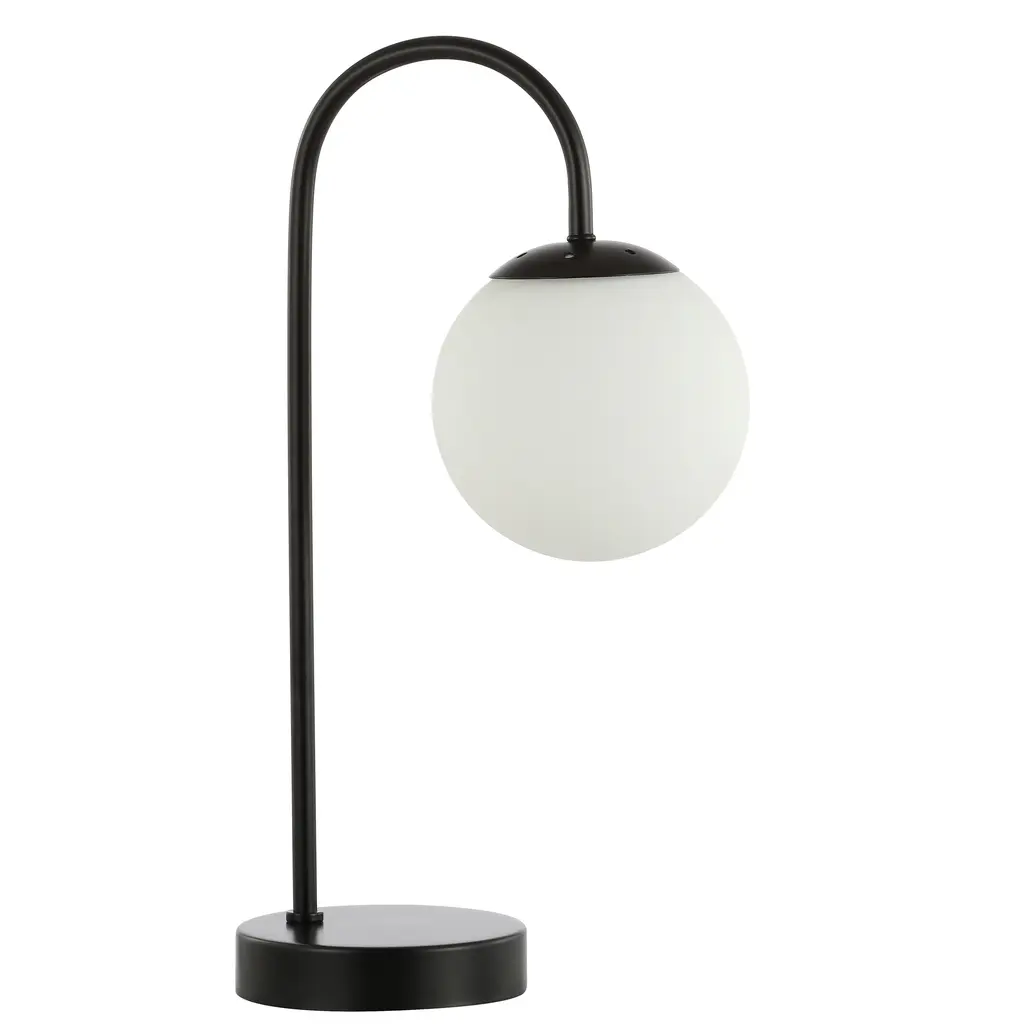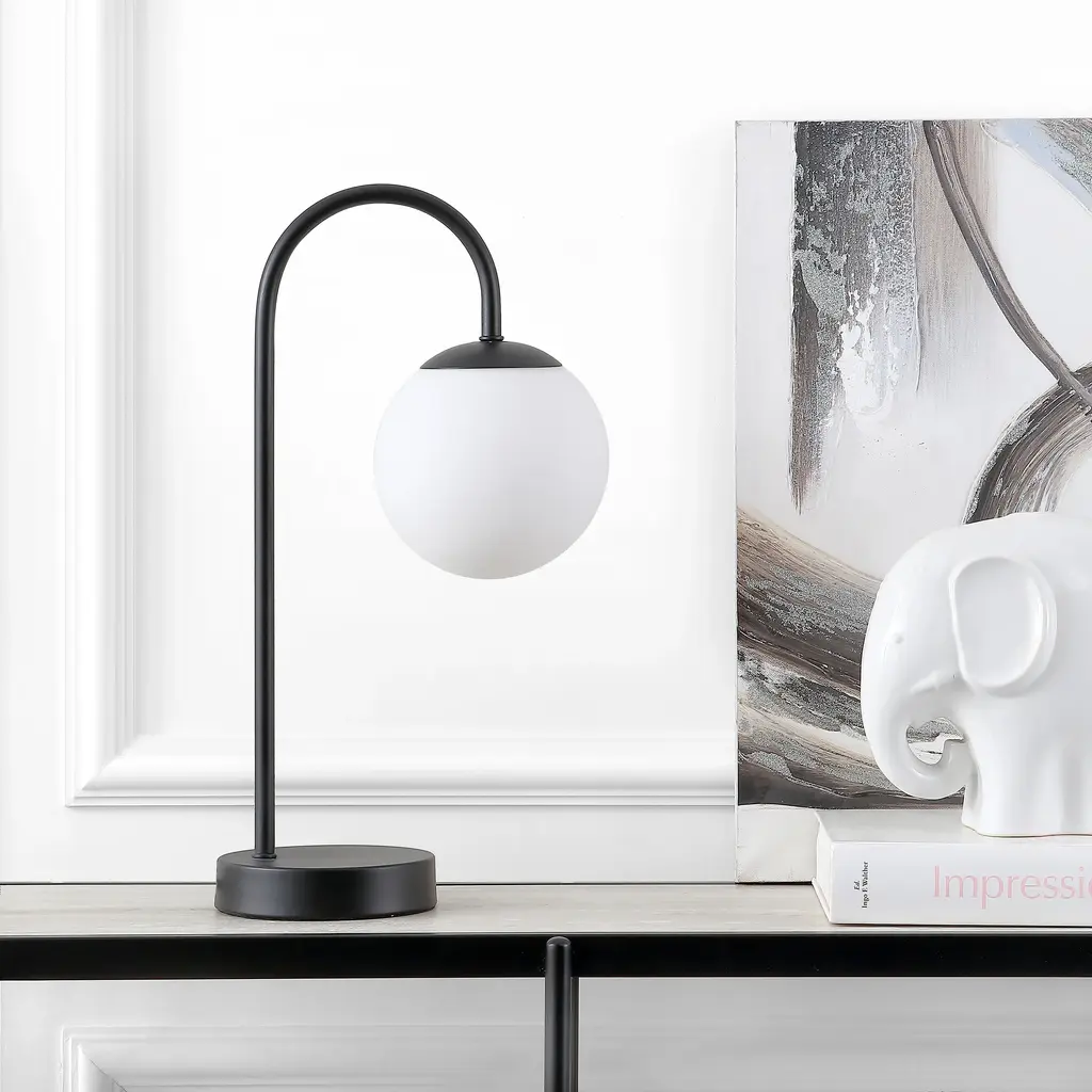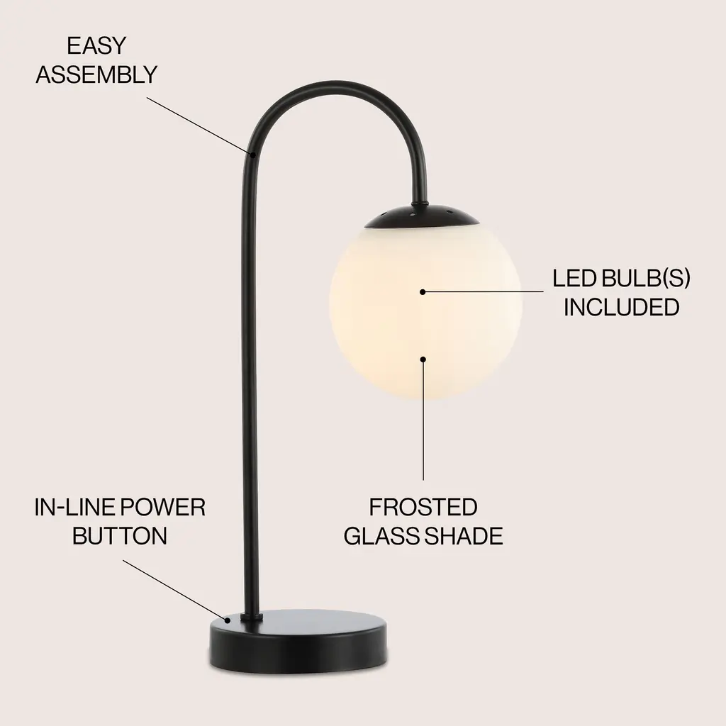With its sleek lines and black metal finish, this arched table lamp has a modern, minimalist-inspired aesthetic. The frosted glass globe shade diffuses the light from a single LED bulb. Add some mood lighting to a living room, bedroom or dining room; order two for a chic, modern console table.Features:Dimensions:About us:You see a lamp.We see a decorative work of art.A perfectly curved shade casts a dramatic shadow on a floor. A silk cord you never want to hide. Compatible with LED lightbulbs: as easy on the environment as they are on the eyes. The JONATHAN Y Lighting collection considers every detail from impeccably sourced materials to designer styling. And our prices are so attractive, we've transformed a functional necessity into a fashion accessory.JONATHAN Y Lighting - a fashion revolution in home decor.