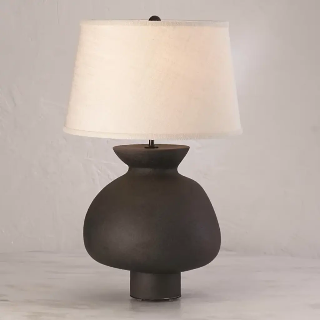 The Casis Table Lamp by Global Views has an organic form and modern feel that brings a lovely touch to the spaces it brightens. Topped with a round, hardback shade with burlap that lends a little bit of texture to the light it filters, the body of this lamp is formed by hand from earthenware. The softly rounded silhouette, flared top, and cylindrical bottom of this table lamp brings a cool, captivating look to the rooms it illuminates.