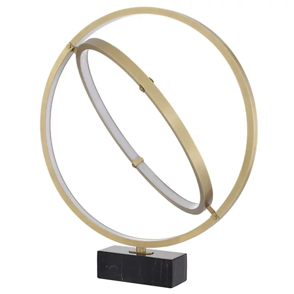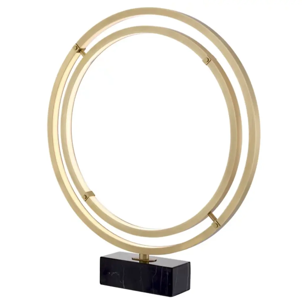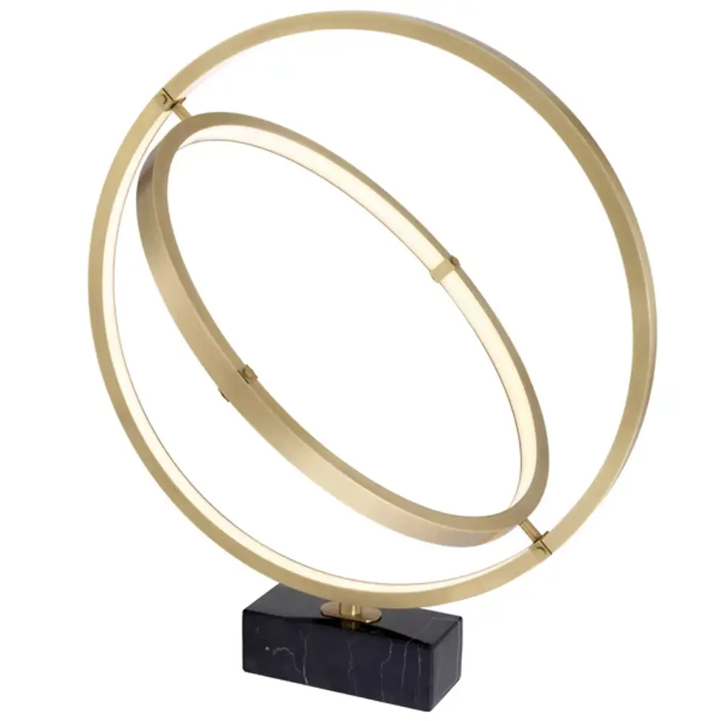 A simple structure with a layered design. The Cassini LED Table Lamp from Eichholtz rises from a low-profile rectangular prism base in black marble, securing two pivoting metal ring housings above it that seat potent LED lamping beneath inset translucent diffusers. The form resembles that of an armillary sphere that displays planetary orbits, while the adjustable rings create a customizable blend of glowing ambiance and shadowy accents.