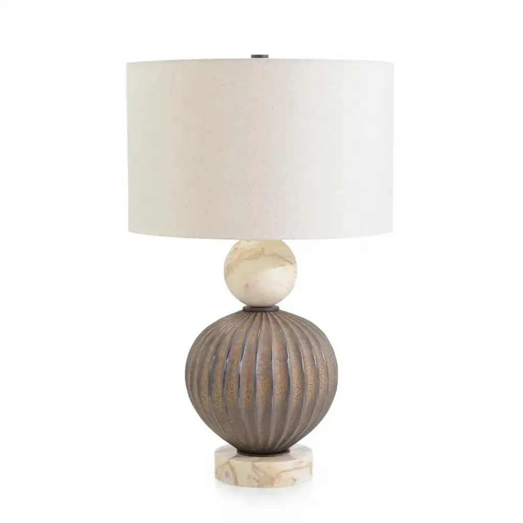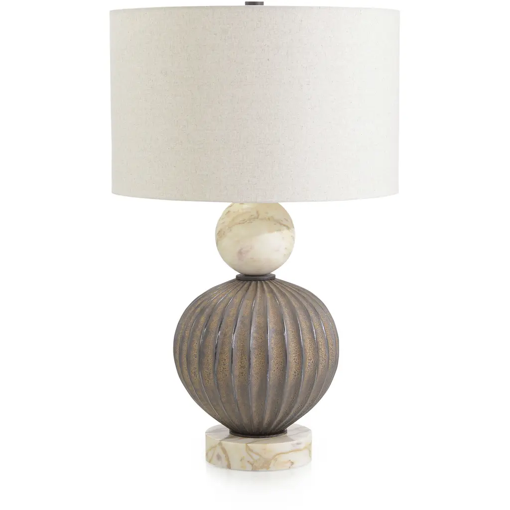 The Cassius Table Lamp is a stunning blend of rich, textural depth and a sophisticated color palette that creates a gorgeous statement in any interior space. The centerpiece of the body is crafted from earthen-toned ceramic that showcases a striated pattern, beautifully complemented by metallic accents and a puck finial in a rusted bronze finish. A sphere of white marble sits atop the ceramic orb, matched by a rounded marble base to complete the look of this turnkey lamp.