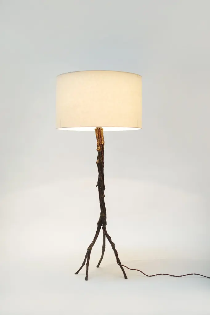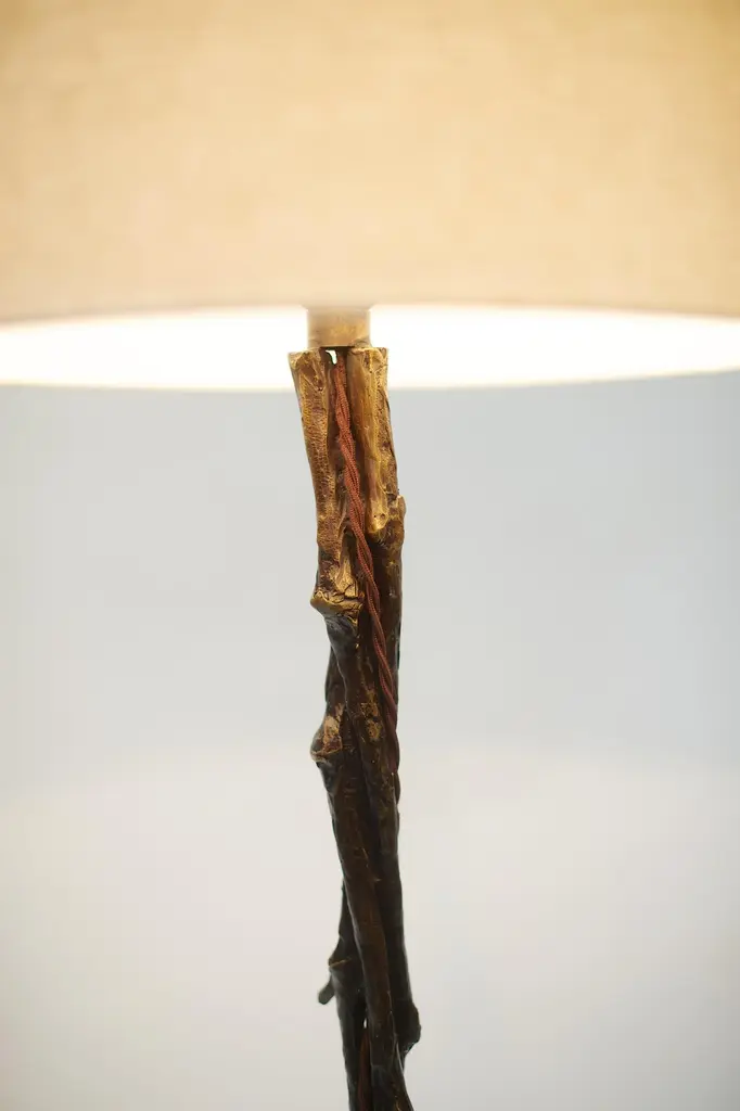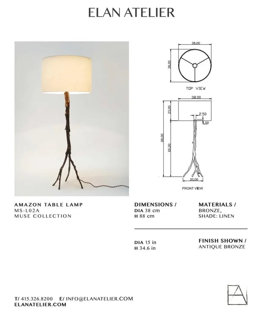 Cast Bronze Amazon Table Lamp with Linen Shade by Elan AtelierBronze table lamp inspired by natural vines and forms in the style of sculptor Giuseppe Panone. Shown in dark bronze with linen shade. Custom sizes and finishes available.Table Lamp/dia 15 x h 34.6 india 38 x h 88 cmFloor Lamp/dia 20.1 x h 66.3 india 51 x h 168.5 cm