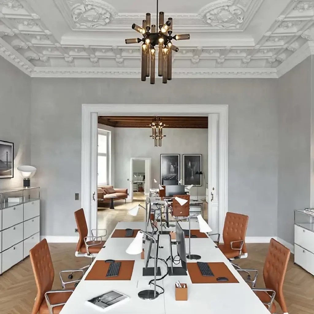 The Castle LED Chandelier from Roll & Hill offers restrained and elegant appeal to indoor ceilings. An enduring, endearing design from the mind of Jason Miller and taking on the stylized shape of the Chess “Rook” piece, this effervescent transitional construction of machined aluminum and smooth glass cylinders descends from a low profile canopy via a single central stem to a geometric platform below. The lamping is comprised of small, strong LED lamps providing energy-efficient ambiance, shining out through slender glass cylinders to create an unforgettable ambiance, shining out in all the directions a Rook can move.