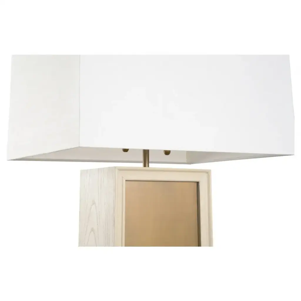 Introducing our Caswell Table Lamp, an exquisite bleached wood lamp, crafted to perfection to enhance any interior with its natural beauty. A striking antique brass panel inset serves as the focal point, adding a touch of vintage allure. With two lights operated by convenient pull chains and crowned with a rectangular off-white shade, this lamp exudes both functionality and elegance, illuminating your space with effortless style and charm.