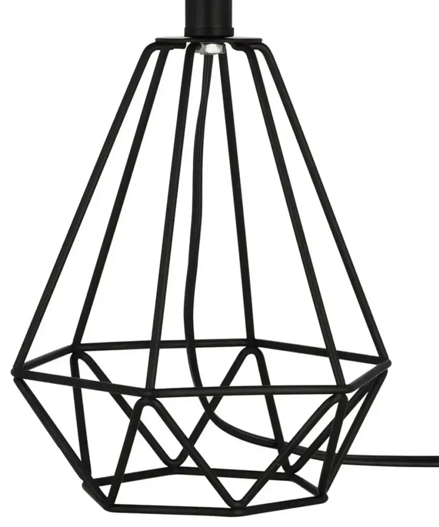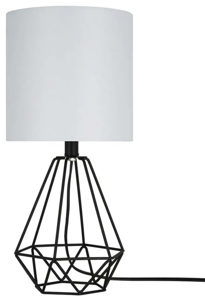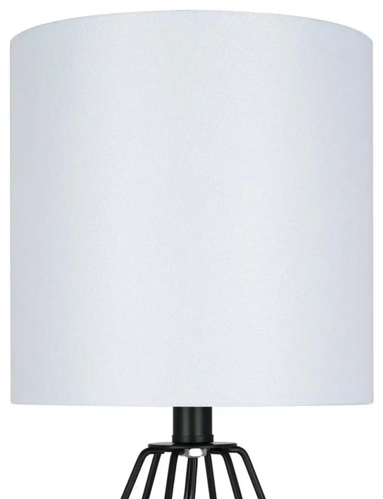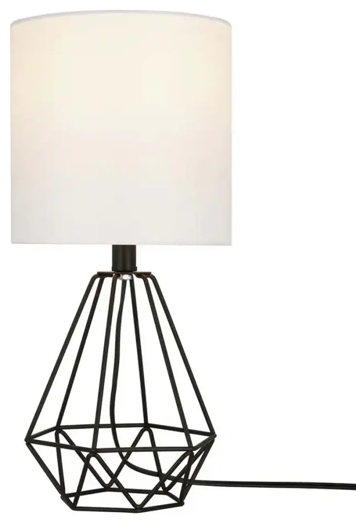 This industrial table lamp features a geometric metal cage body in a matte black finish and a white linen drum shade. Its clean lines and modern silhouette makes this the perfect accent piece for any room in your home. 17" height means this is a small table lamp/accent lamp, which makes this lamp perfect for small end tables or desks. FINISH - Geometric metal cage body in a Matte Black Finish and a White Linen Drum Shade.DIMENSIONS - Assembled dimensions: 7.9" Width X 17.25" Height. Shade dimensions 7.9" wide x 8" high.LIGHTING - 60w max standard base bulb required, not included.FEATURES - Energy-saving LED bulb recommended (not included) to reduce energy consumption, lower costs, and contribute to a more sustainable future.EASY ASSEMBLY - Plug in power source. Easy assembly.