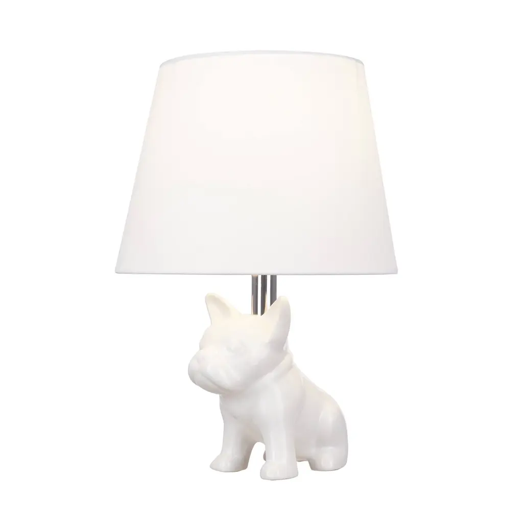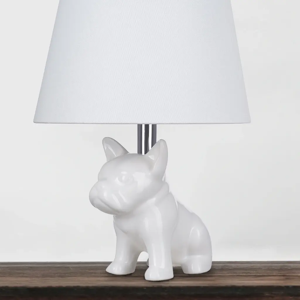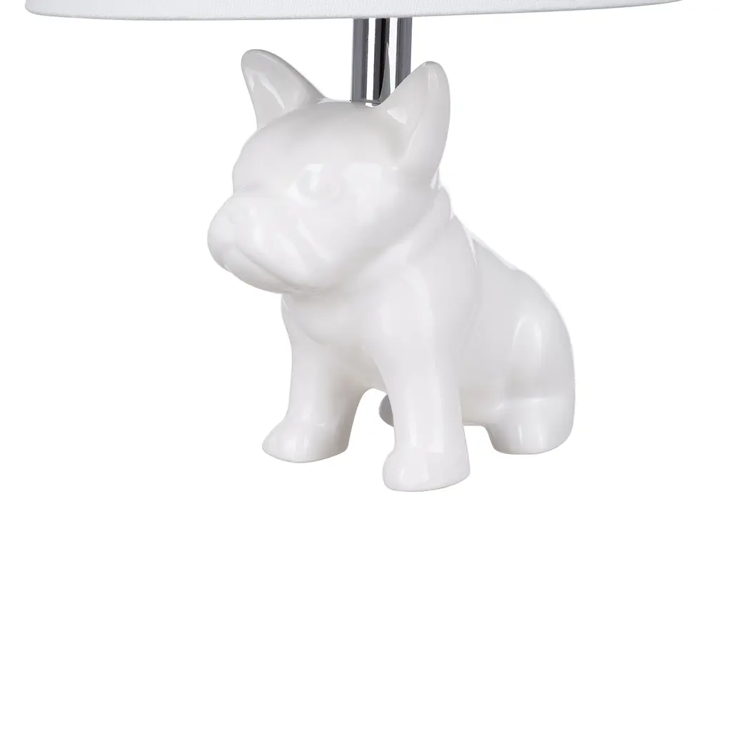 Here is a novelty lamp that knows how to sit, stay, and brighten any space. Featuring a ceramic French bulldog figure sitting charmingly under a white shade, this whimsical accent lamp provides ample ambient light. This lamp features a white linen shade and an on/off switch on socket with a 60" clear power cord. A compact design makes it the perfect bedside companion or darling addition to the dorm, kids room, living room or office workspace. LED Bulb NOT Included.Ceramic children's table lamp in whiteAssembled dimensions: 11"W x 11"D x 19"HWhite linen drum shade, 11"W x 11"D x 9"HOn/Off switchUses one type A19 E26/Medium 60-watt incandescent or LED equivalent bulb (not included)Shade Dimensions: 11 inches depth x 11 inches width x 9 inches heightCord Length: 60 inchesSocket Quantity: 1Bulb Shape: A19Socket Type: E26Light Bulb Type: Replaceable LEDLight Bulb Included: NoVoltage: 120Fixture Dimmable: Yes