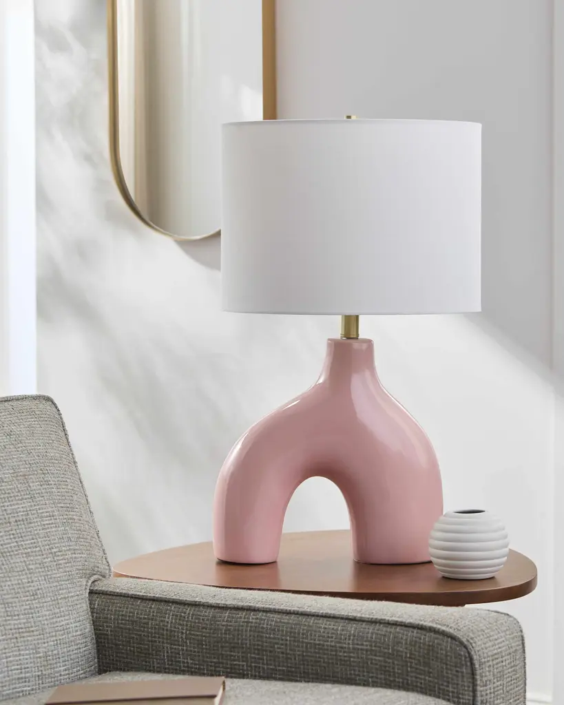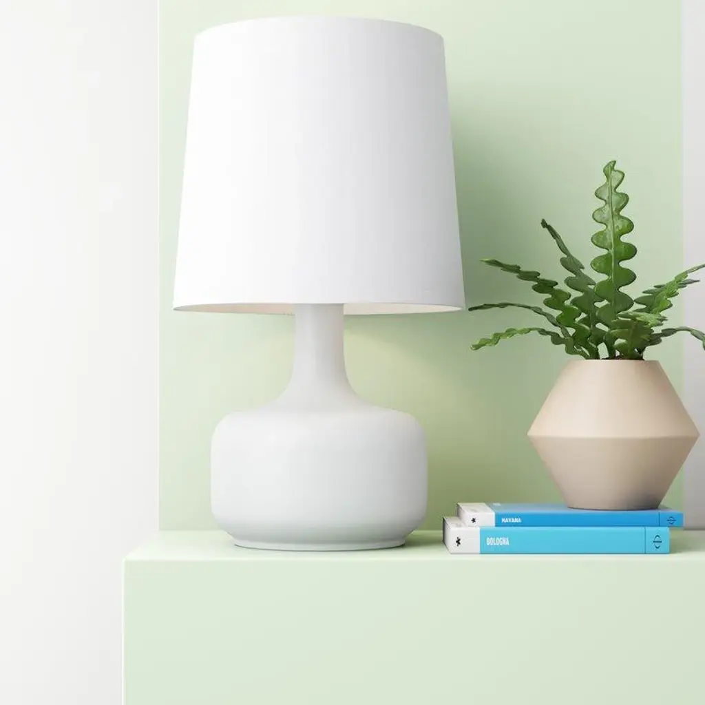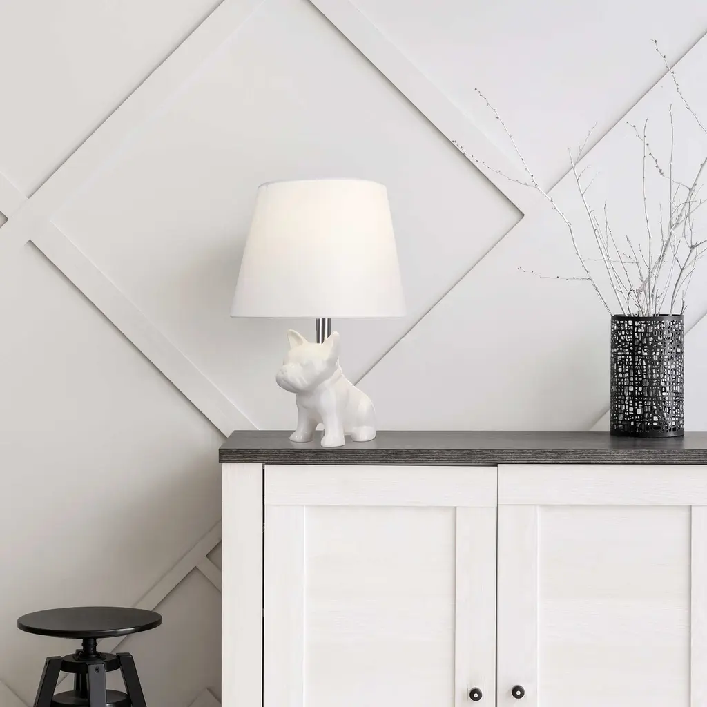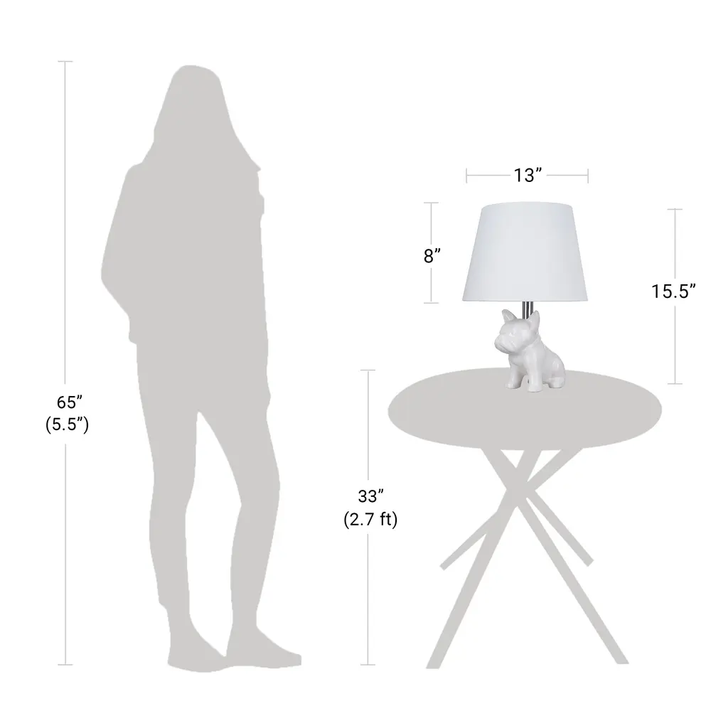 Here is a novelty lamp that knows how to sit, stay, and brighten any space. Featuring a ceramic French bulldog figure sitting charmingly under a white shade, this whimsical accent lamp provides ample ambient light. This lamp features a white linen shade and an on/off switch on socket with a 60" clear power cord. A compact design makes it the perfect bedside companion or darling addition to the dorm, kids room, living room or office workspace. LED Bulb NOT Included.Ceramic children's table lamp in whiteAssembled dimensions: 11"W x 11"D x 19"HWhite linen drum shade, 11"W x 11"D x 9"HOn/Off switchUses one type A19 E26/Medium 60-watt incandescent or LED equivalent bulb (not included)Shade Dimensions: 11 inches depth x 11 inches width x 9 inches heightCord Length: 60 inchesSocket Quantity: 1Bulb Shape: A19Socket Type: E26Light Bulb Type: Replaceable LEDLight Bulb Included: NoVoltage: 120Fixture Dimmable: Yes