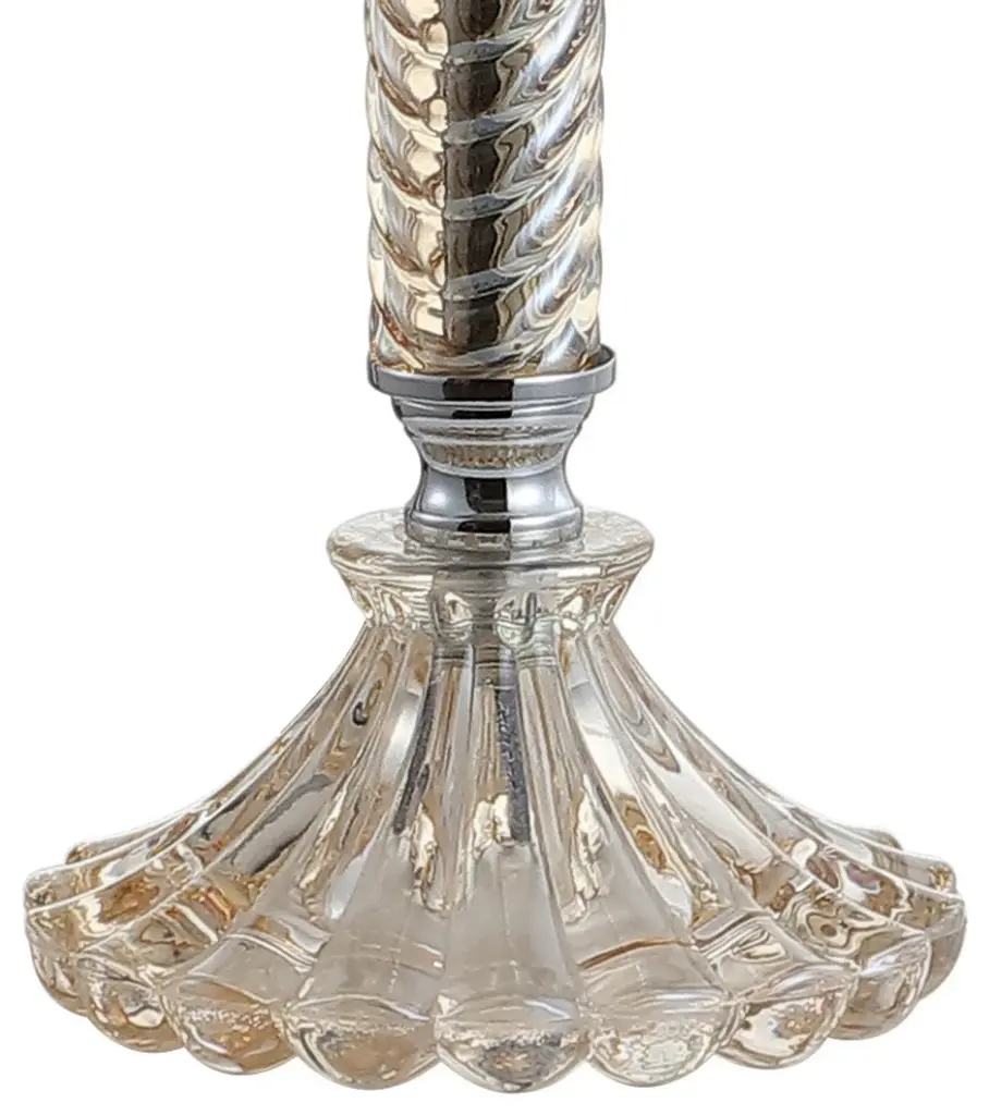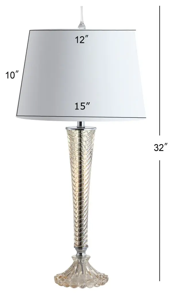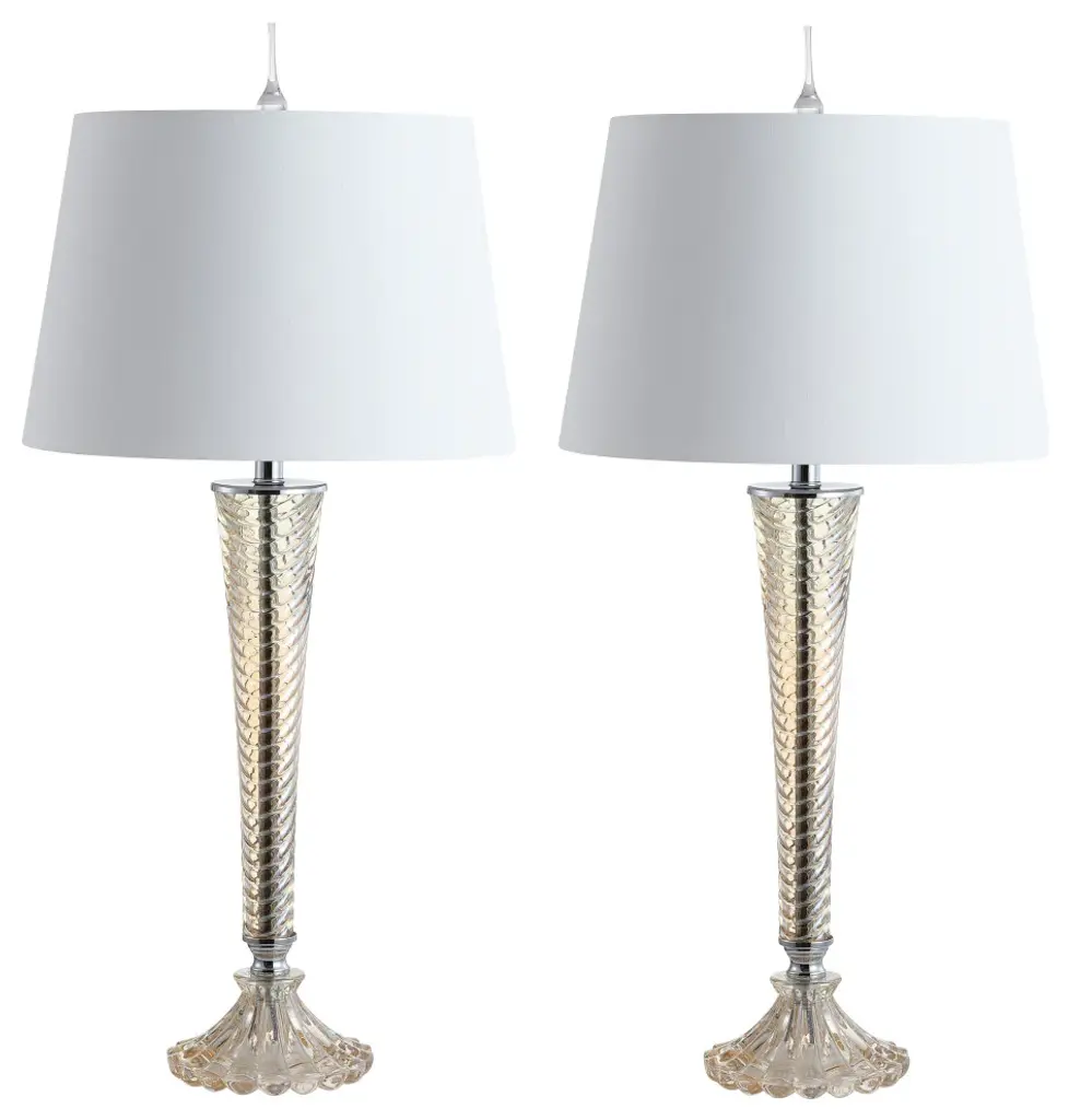 In a champagne-colored glass, it comes as no surprise that our designers were inspired by antique champagne flutes to create the silhouette of this beautiful table lamp. Undeniable elegant, the tall stature is balanced by a slightly tapered faux silk drum shade. With an eye to detail, the finishing touches are crafted with quality and beauty in mind -- chrome plated accents, a crystal ball finial, and a silk-wrapped cord complete the look. Features:• Add a lovely spark to an existing decor with the beautiful presence of this fluted glass table lamp• The shade is faux silk, adding to the formal nature of this style • Beautiful to display or easy to conceal: the 60" cord is silk-wrapped• On-off rotary switch on socket• Eco-friendly 9W LED bulb included• Takes one bulb and compatible with any 12W LED or 100W TYPE "A" or 23W CFL• UL Listed • Color: Champagne with white shade• Body Material: Glass• Base Material: Glass• Finial Material: Crystal• Finial Color: Clear• Harp Color: Silver• Includes: Two (2) lamps• Minor Assembly RequiredDimensions:• Lamp: 32 inches high x 15 inches wide x 15 inches deep• Shade: 10 inches high x 15 inches wide x 15 inches deepAbout us:You see a lamp.We see a decorative work of art.A perfectly curved shade casts a dramatic shadow on a floor. A silk cord you never want to hide. Compatible with LED lightbulbs: as easy on the environment as they are on the eyes. The JONATHAN Y Lighting collection considers every detail from impeccably sourced materials to designer styling. And our prices are so attractive, we''ve transformed a functional necessity into a fashion accessory.JONATHAN Y Lighting - a fashion revolution in home decor.
